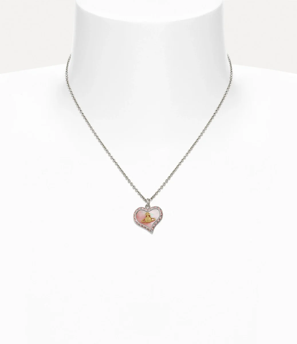 Nuestro collar con colgante Petra revive el motivo asimétrico del corazón, característico de la casa, sinónimo del afecto de Vivienne por la humanidad y el planeta. El motivo está delineado con cristales de color rosa y rematado con un motivo de esfera dorada en el centro del diseño.