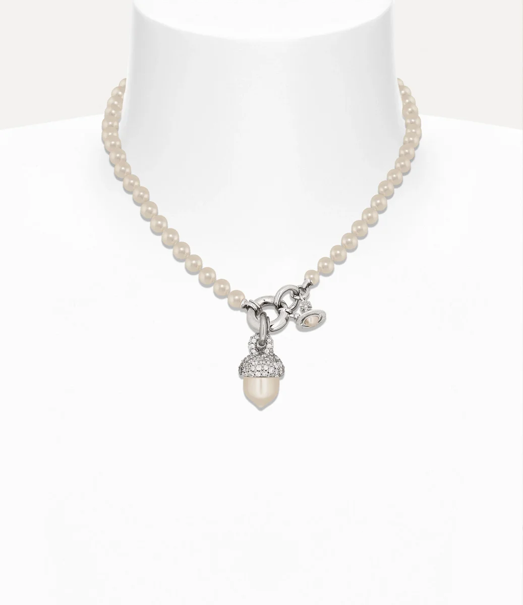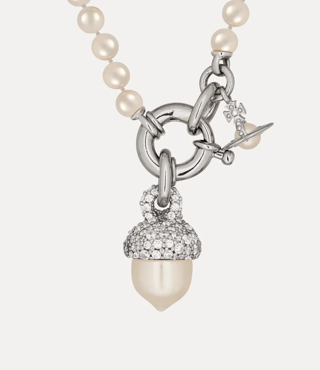 El collar Lucille Pearl evoca una sensación de grandeza y lujo, con una hilera de brillantes perlas de cristal Swarovski. En el centro, un motivo de bellota adornado con pavé y con un lustroso acabado perlado cuelga junto a una esfera de perlas, envuelta en una estructura metálica pulida en tono plateado.