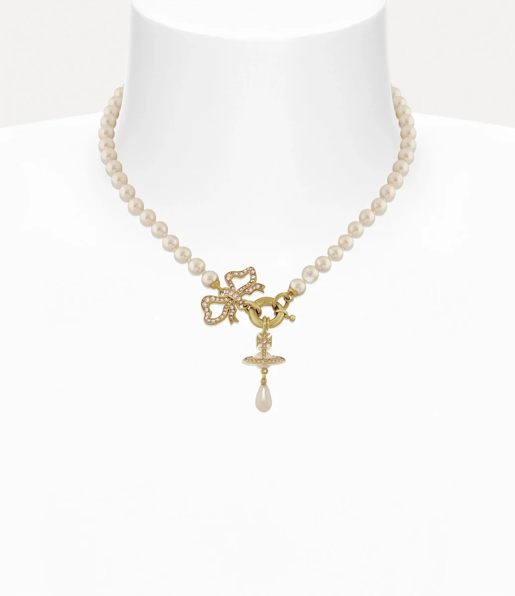 El collar Rigoberta Pearl, el último diseño de la gama Rigoberta, cuenta con una fila de perlas de cristal Swarovski y un intrincado charm en forma de lazo de inspiración georgiana, un elemento icónico de la casa. En el centro, el motivo tridimensional del orbe se destaca por un detalle de perla en forma de lágrima, rematado con un cierre de resorte.