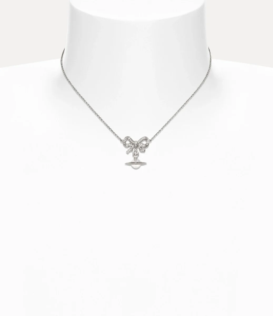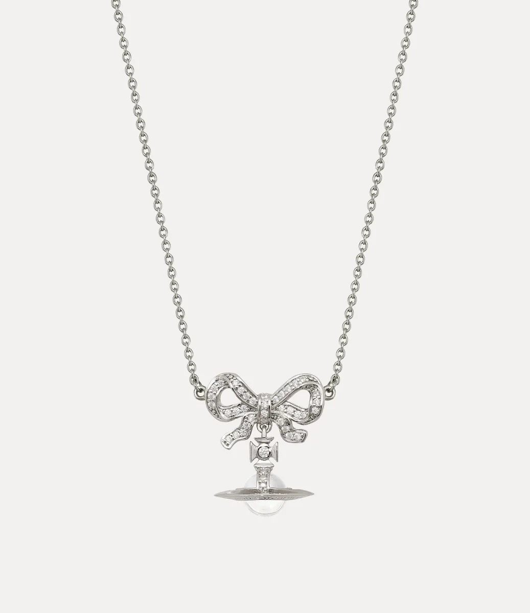 Nuestra gargantilla Octavie presenta un diseño en forma de lazo que recuerda a las joyas georgianas, adornada con cristales brillantes engastados en pavé con acabado blanco. Esta pieza incorpora nuestro característico motivo tridimensional de esfera colgante, con una gema transparente finamente trabajada en el centro.