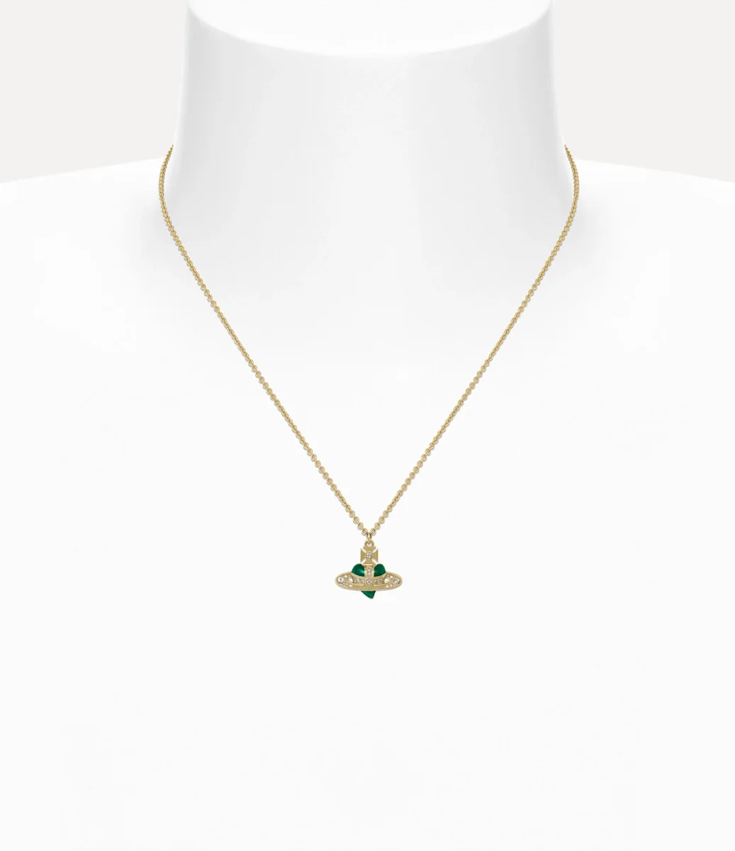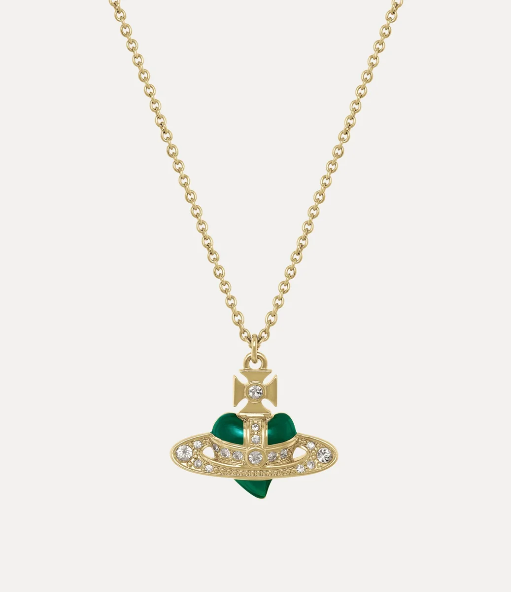 La forma de corazón se ha convertido en un estilo característico de la casa, sinónimo del afecto de Vivienne por la humanidad y el planeta. Nuestro nuevo collar con colgante de corazón de diamantes revive nuestra icónica silueta de corazón asimétrico, perfilada con cristales dorados y rematada con esmalte translúcido pintado a mano en el centro del diseño.