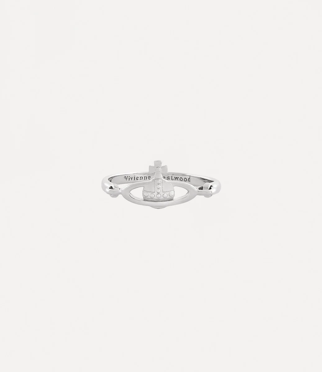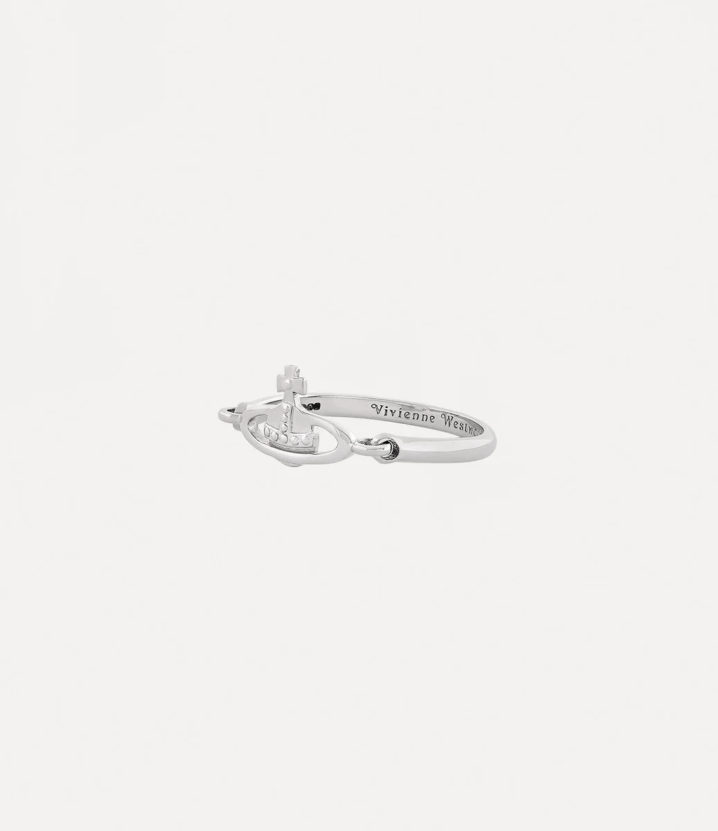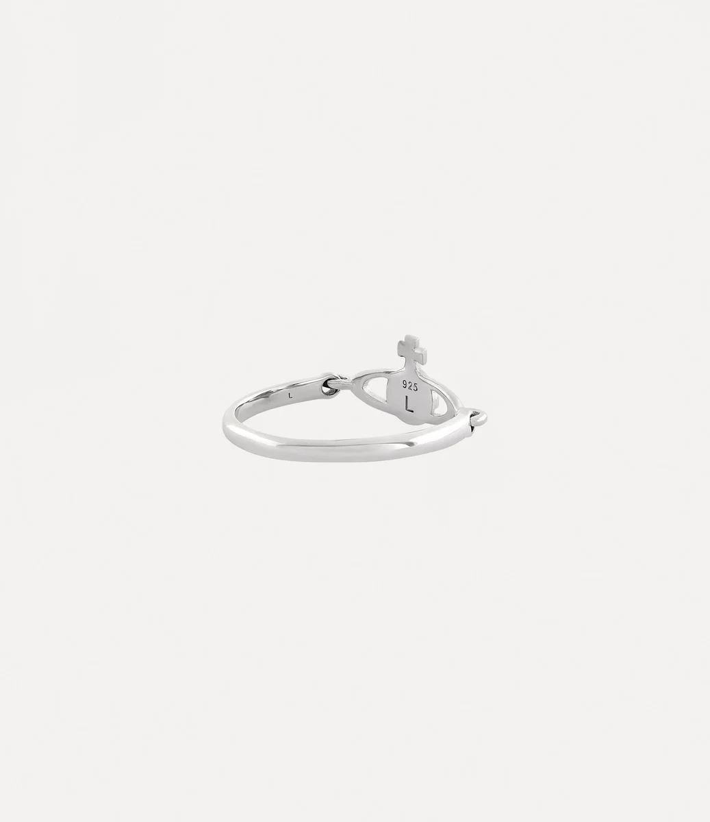 Nuestro anillo Vendome en plata chapada en platino presenta un delicado diseño con bandas, rematado con un motivo esférico recortado en la parte frontal que puede girar sobre sus bisagras, sinónimo de la visión de Vivienne de llevar la tradición hacia el futuro. Para rematar, la pieza está grabada con el motivo tipográfico característico de nuestra casa en el interior.