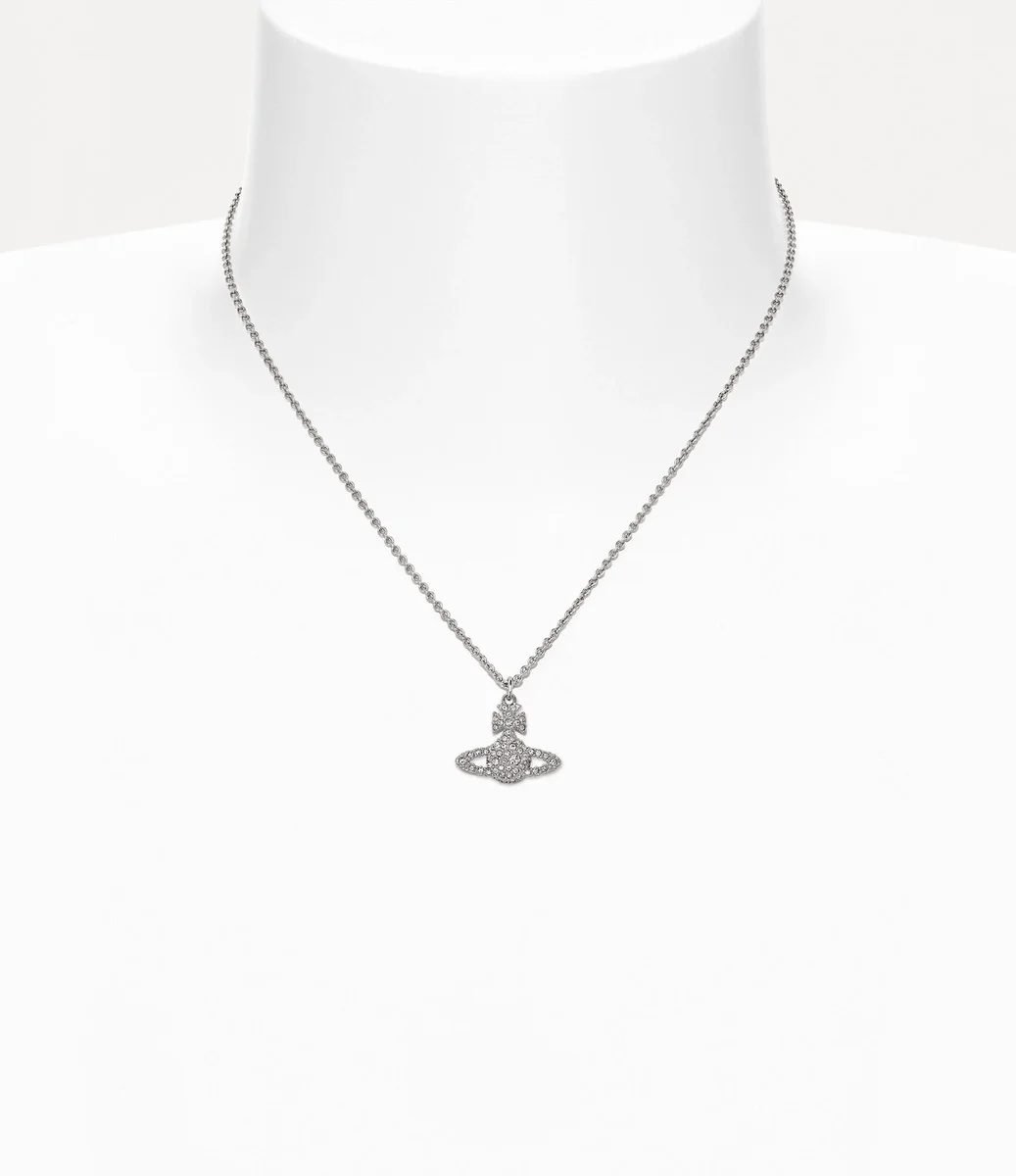 El collar con colgante Grace Bas Relief rinde homenaje a la visión de Vivienne de lanzar la tradición hacia el futuro, con un motivo de orbe bidimensional en el centro del diseño. La pieza presenta una superficie de cristales blancos que decoran la silueta, con un acabado plateado pulido.