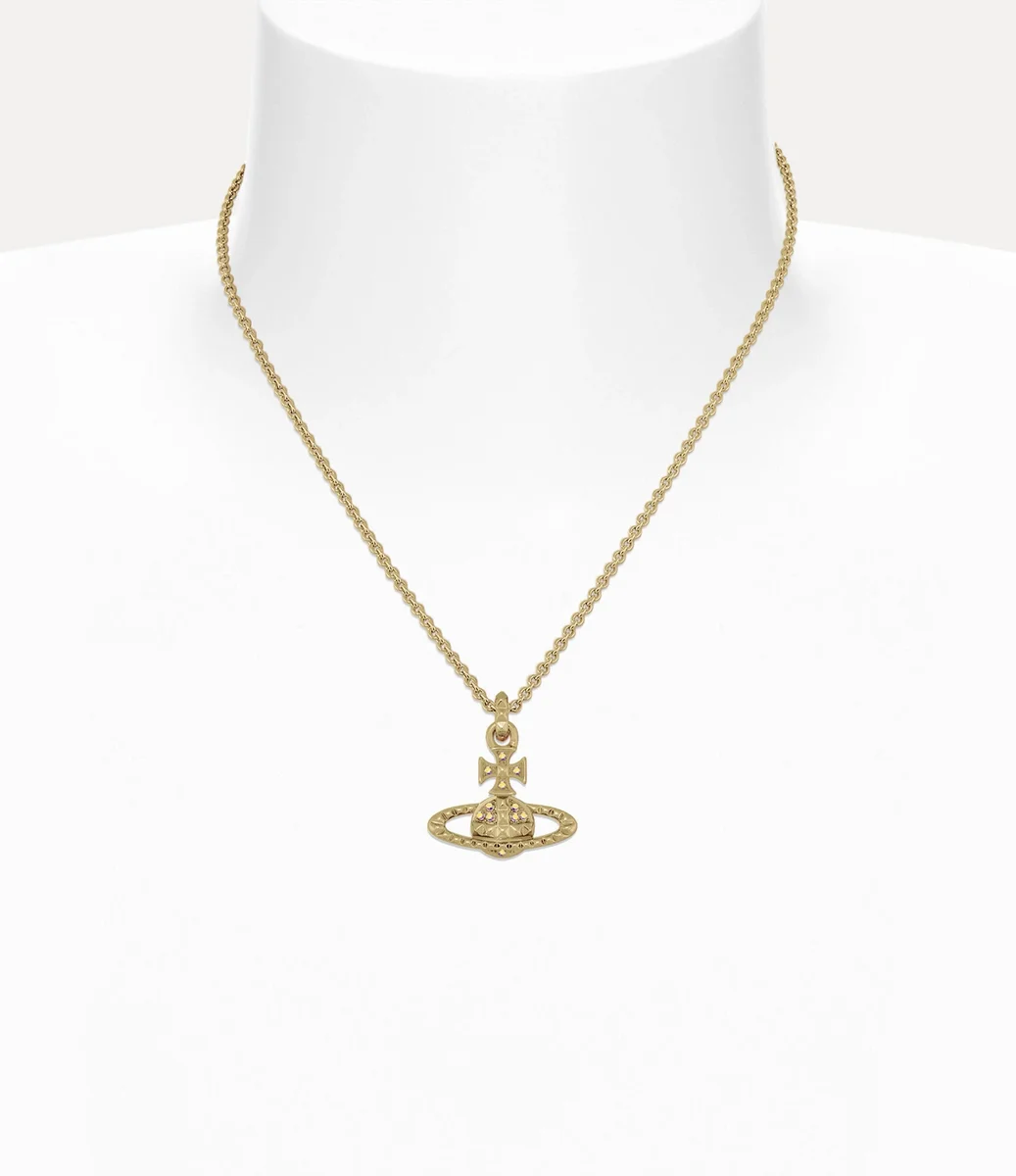 El collar con colgante Mayfair Bas Relief regresa esta temporada con un baño dorado y brillantes adornos de cristal iridiscente. La pieza presenta una silueta en forma de esfera, sinónimo de la visión de la casa de lanzar la tradición hacia el futuro, y se completa con detalles de tachuelas, símbolos de inconformismo, siguiendo el característico enfoque punk de Vivienne.