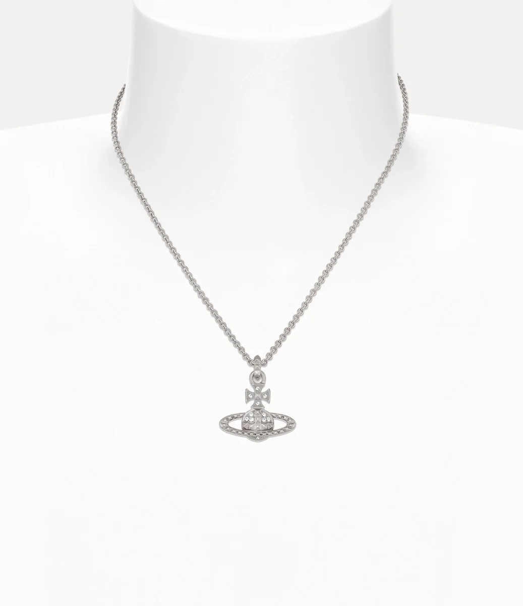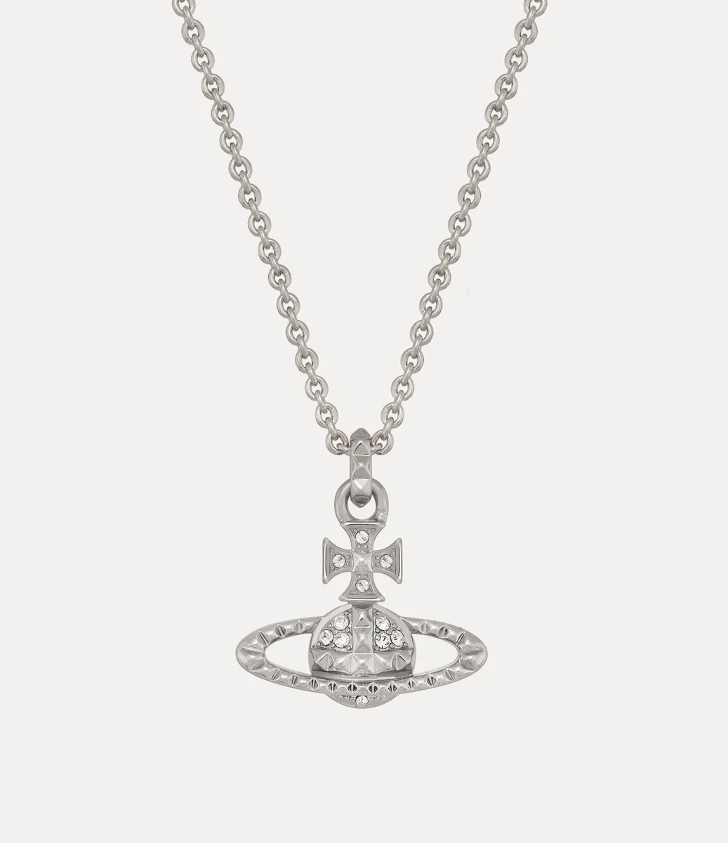 El collar con colgante Mayfair Bas Relief vuelve esta temporada con un baño plateado y brillantes adornos de cristal. La pieza presenta una silueta en forma de esfera, sinónimo de la visión de la casa de lanzar la tradición hacia el futuro, y se completa con detalles de tachuelas, símbolos de inconformismo, siguiendo el característico enfoque punk de Vivienne.