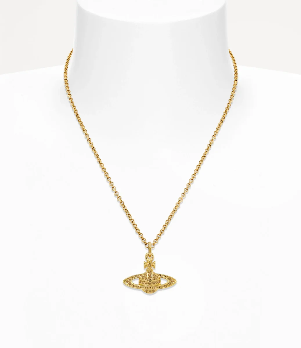 Nuestro collar con colgante mini bajorrelieve presenta un perfil metálico dorado, con detalles de cristales brillantes en tonos similares. La pieza revive nuestro característico motivo orbital bidimensional, rematado con una etiqueta ovalada grabada en el clásico cierre de langosta.