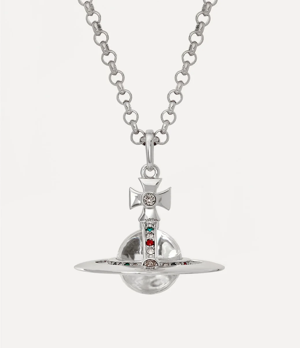 Nuestro collar con colgante New Small Orb presenta un distintivo orbe tridimensional con una bola de cristal transparente en el centro, inspirado en el icónico motivo en forma de orbe de la casa, que recuerda la visión de Vivienne de fusionar la tradición con el futuro. Incrustado con una serie de cristales multicolores, el collar se completa con una etiqueta en relieve en el cierre.