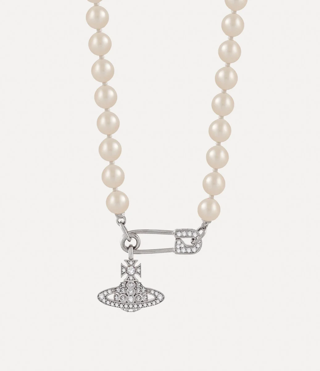 Las perlas son un elemento clave de la iconografía de la casa, ya que simbolizan una sensación de lujo y rebeldía. El collar Lucrece Pearl cuenta con un hilo de perlas de vidrio, resaltadas por una esfera con incrustaciones de cristal que cuelga de un charm en forma de imperdible. Este motivo atemporal del imperdible, símbolo de inconformismo, refleja el icónico enfoque punk de Vivienne.