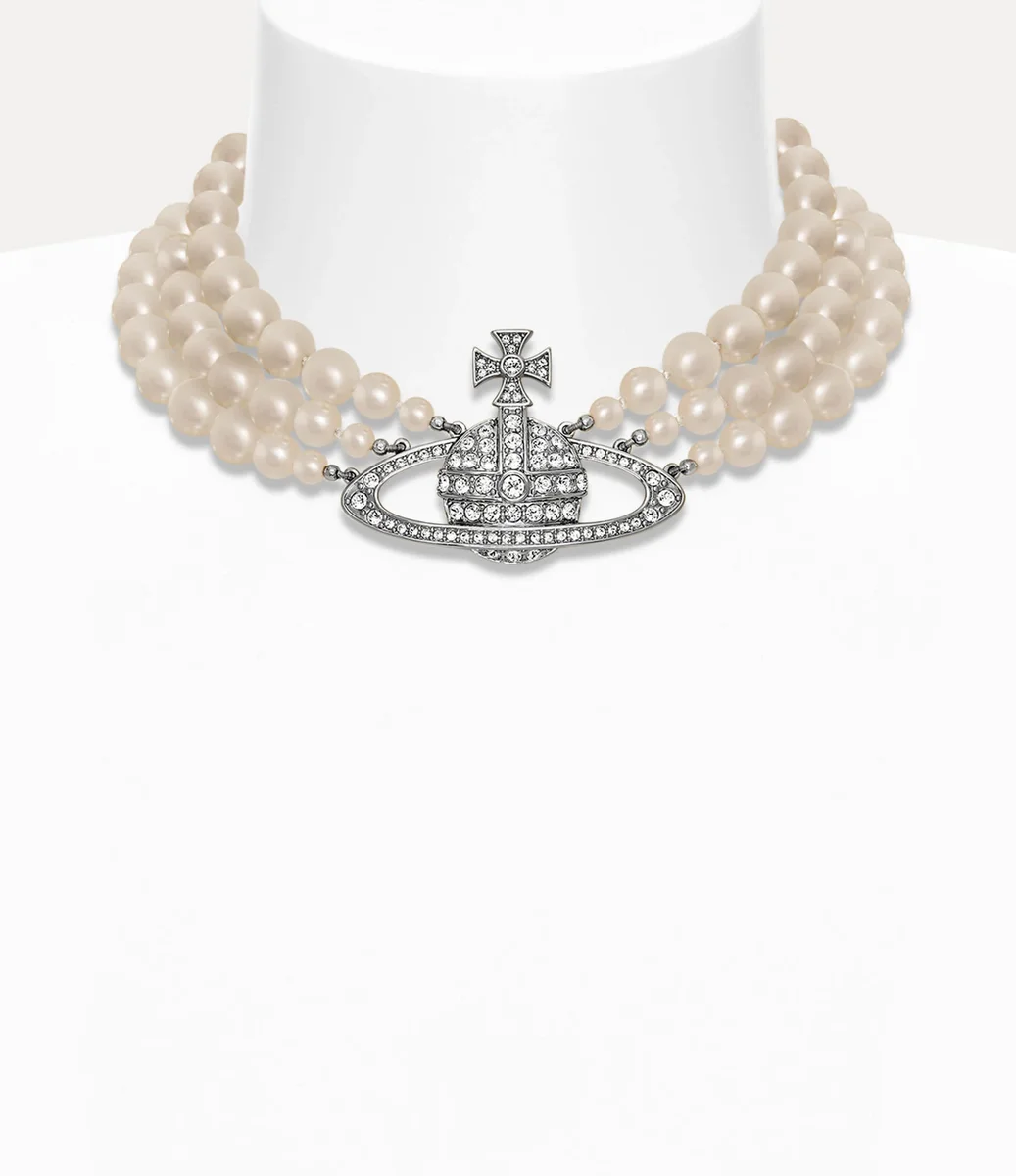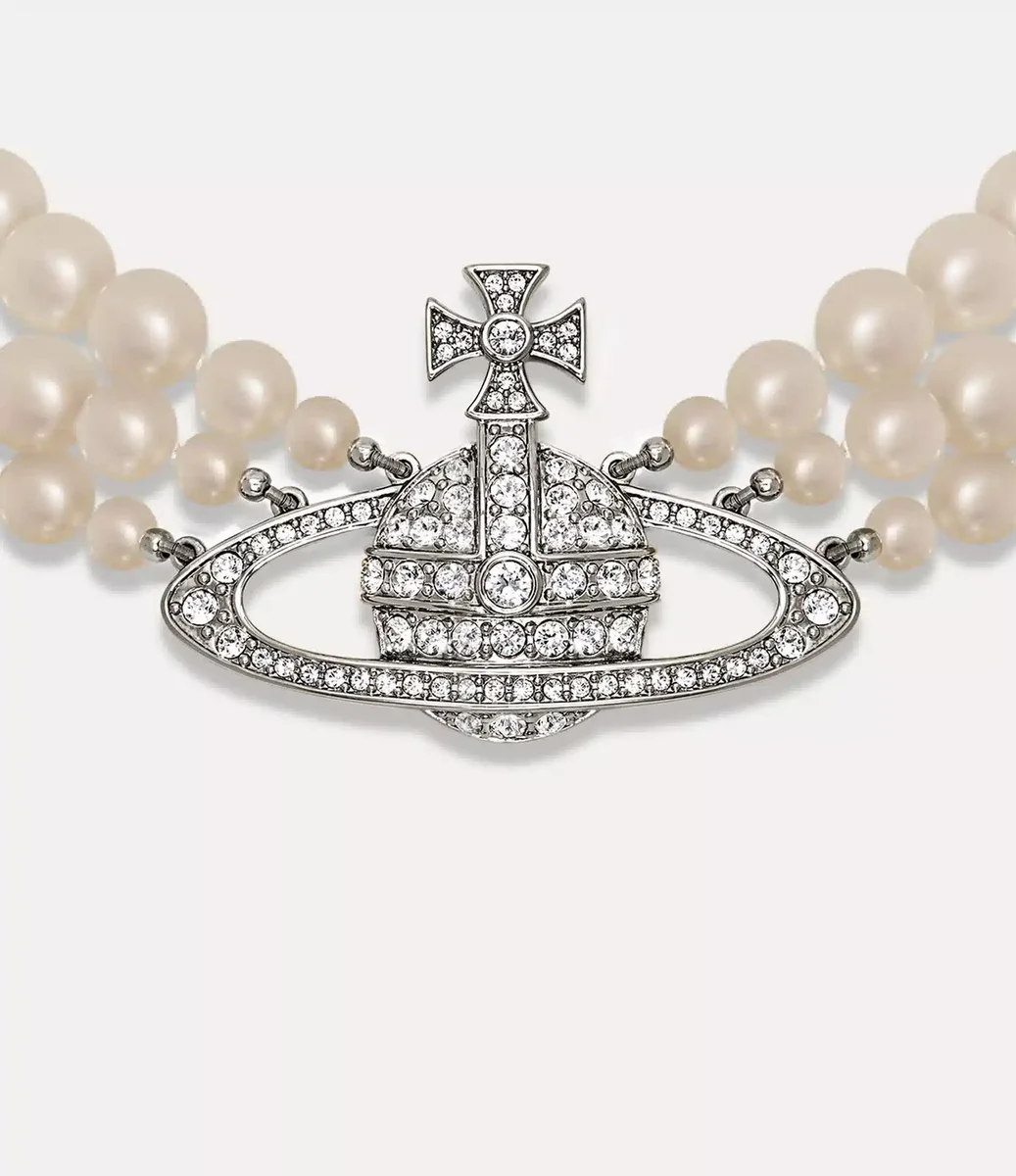 La gargantilla con tres filas de perlas en bajorrelieve, que apareció por primera vez en nuestra icónica colección «Portrait» de 1990, se inspira en las joyas clásicas de perlas e incorpora el enfoque distintivo de Vivienne de fusionar la estética punk con influencias históricas. El diseño presenta un orbe en bajorrelieve central adornado con cristales blancos, que encarna la visión de la casa de lanzar el pasado hacia el futuro.