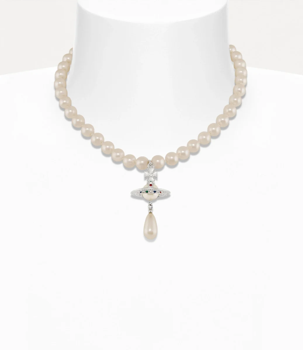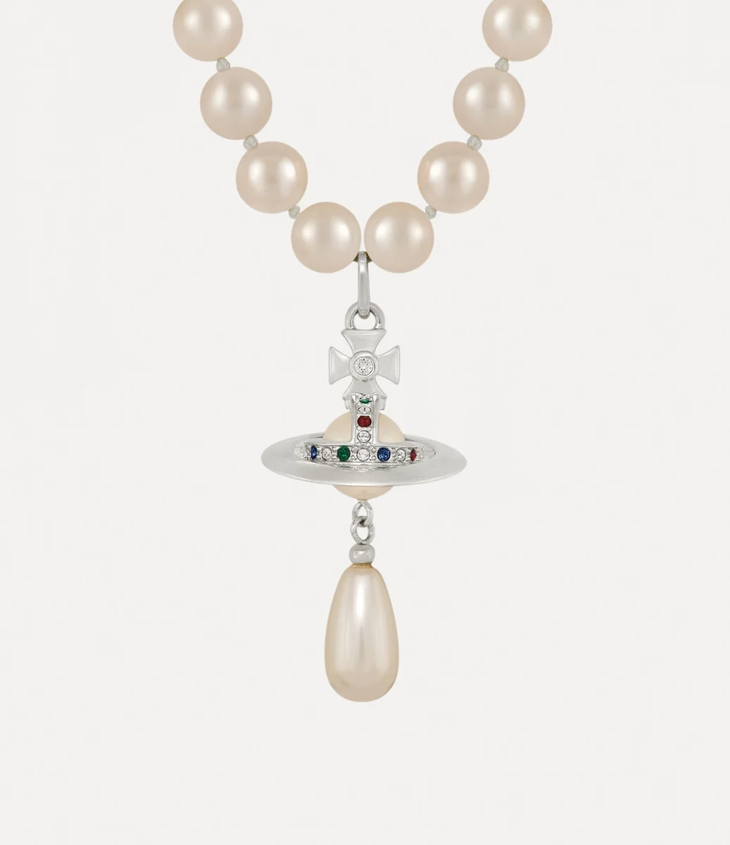 A finales de la década de 1980, Vivienne Westwood presentó su icónico concepto de perlas durante el desfile de moda Harris Tweed Otoño 1987, con una gargantilla de una sola vuelta. Nuestra gargantilla de perlas de una sola vuelta se hace eco de la elegante forma de su diseño original, mostrando un motivo esférico tridimensional adornado con detalles de cristal y una perla en forma de lágrima suspendida.