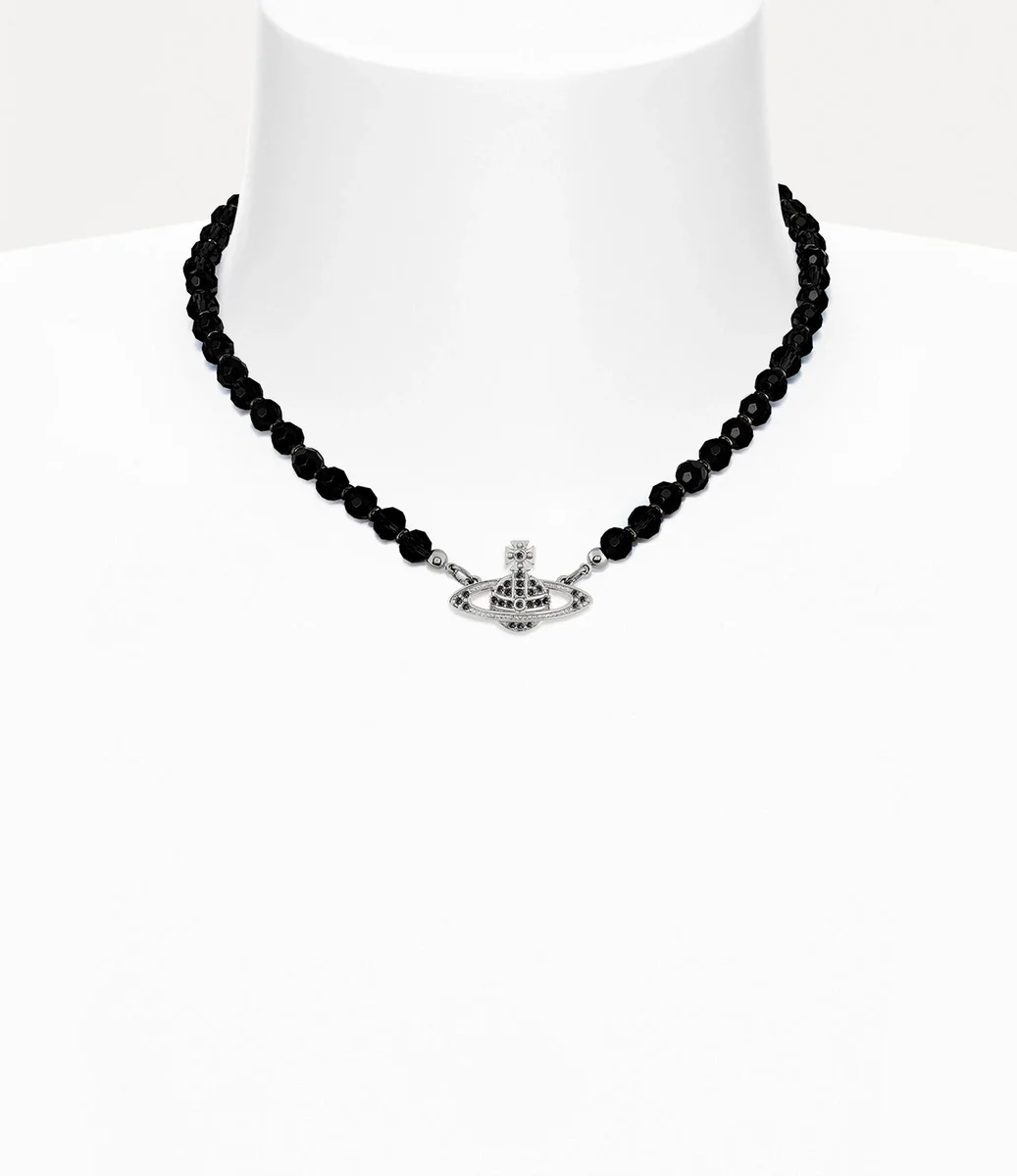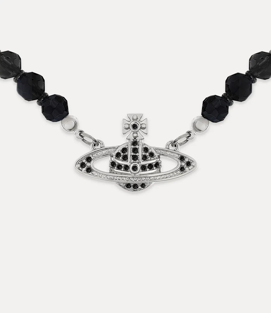Nuestra gargantilla Messaline se ha rediseñado con cristales de ágata negra anudados a mano, cada uno de ellos con un acabado intrincadamente tallado. Esta llamativa pieza cuenta con nuestro colgante esférico característico, adornado con cristales de color negro azabache y baño plateado, que encarna la visión de Vivienne de impulsar la tradición hacia el futuro.