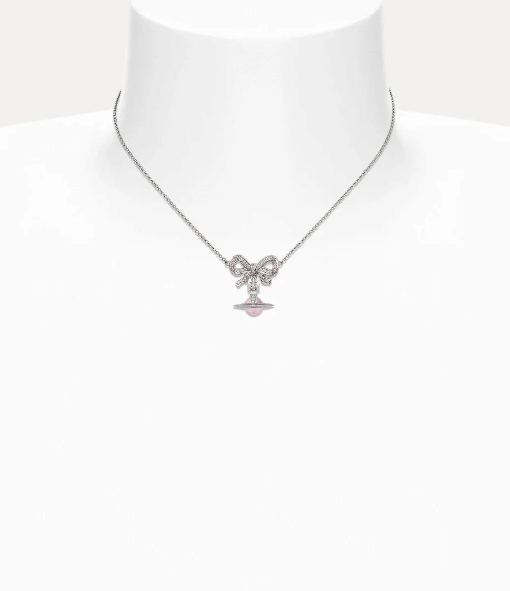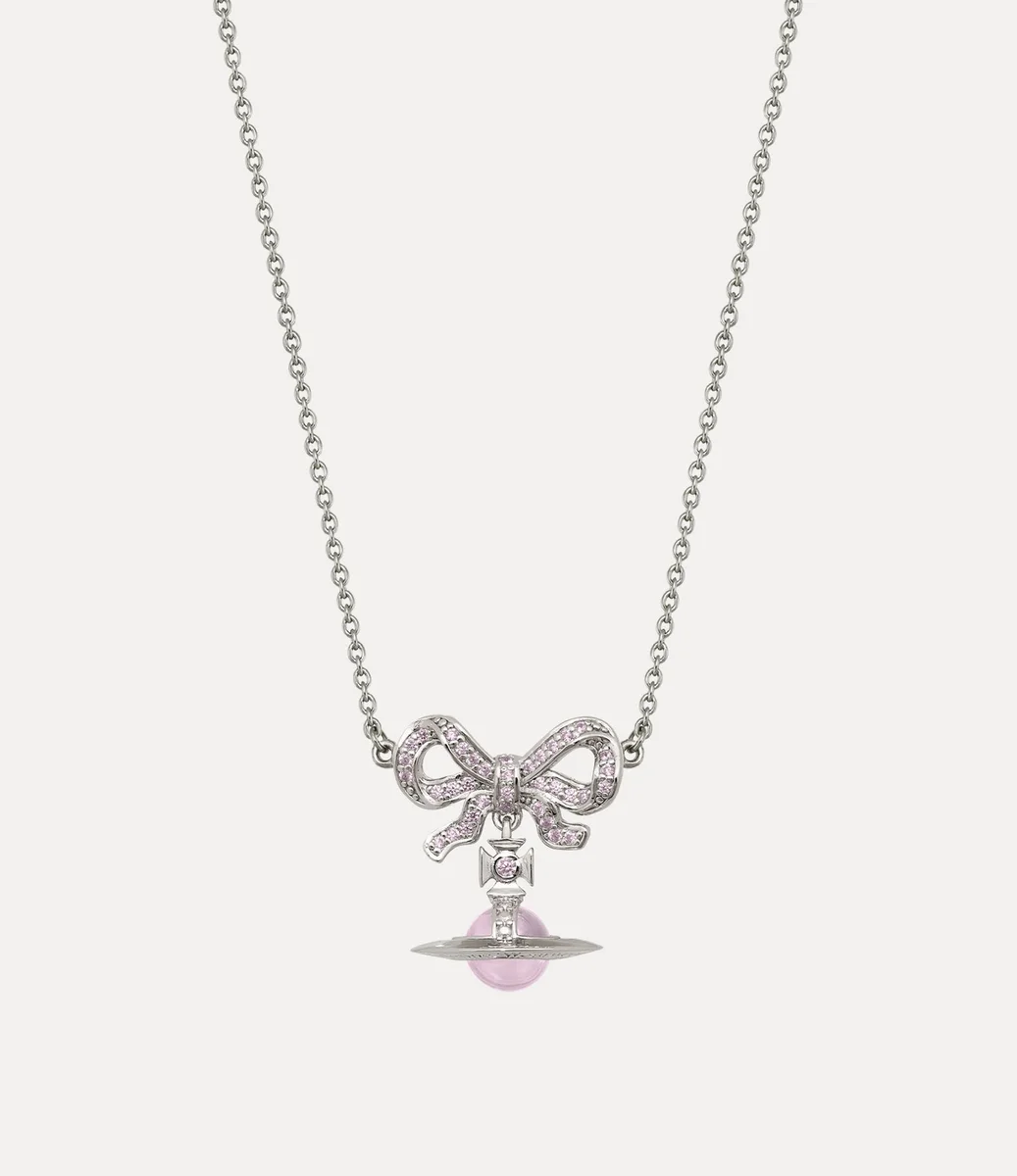 Nuestra gargantilla Octavie presenta un diseño en forma de lazo que recuerda a las joyas georgianas, adornada con cristales brillantes engastados en pavé con acabado rosa. Esta pieza incorpora nuestro característico motivo tridimensional de esfera colgante, con una gema rosa finamente trabajada en el centro.