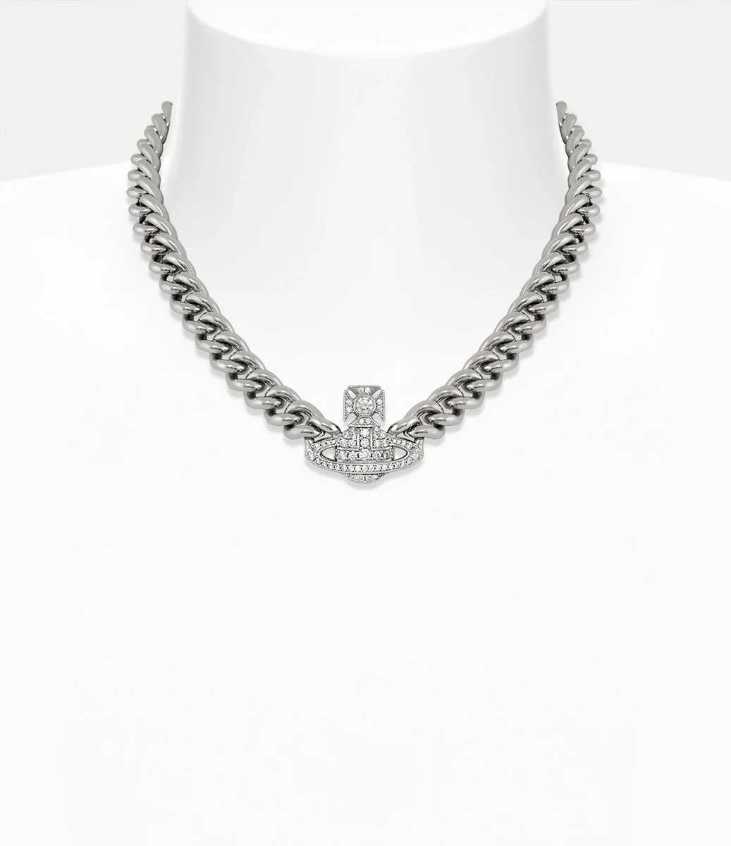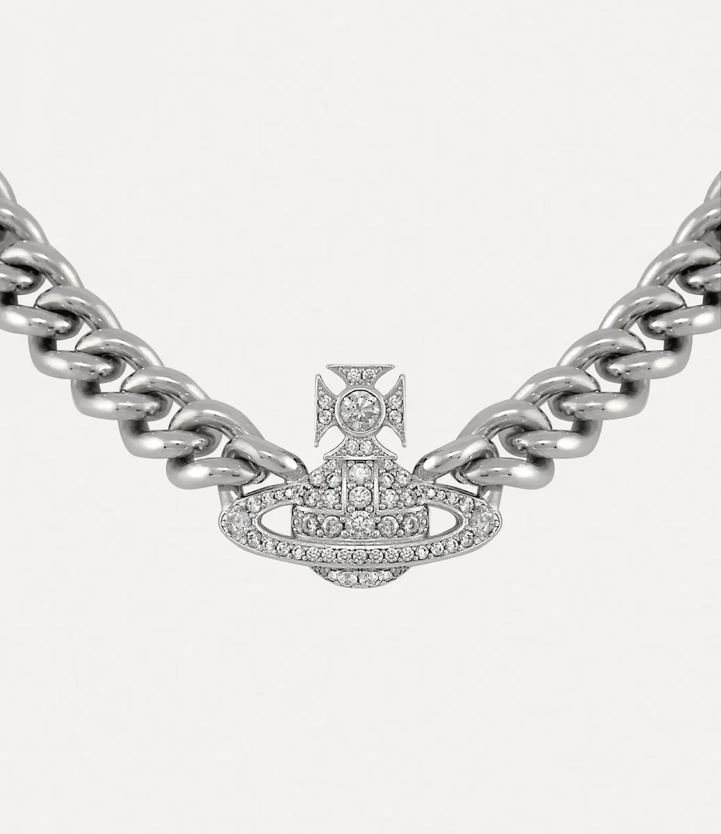 Nuestra gargantilla pequeña Graziella luce nuestro icónico motivo esférico en el centro del diseño, que encarna la visión de Vivienne de lanzar la tradición hacia el futuro. La pieza está adornada con cristales de circonita cúbica blancos y un baño de plata, y se completa con una cadena de eslabones.