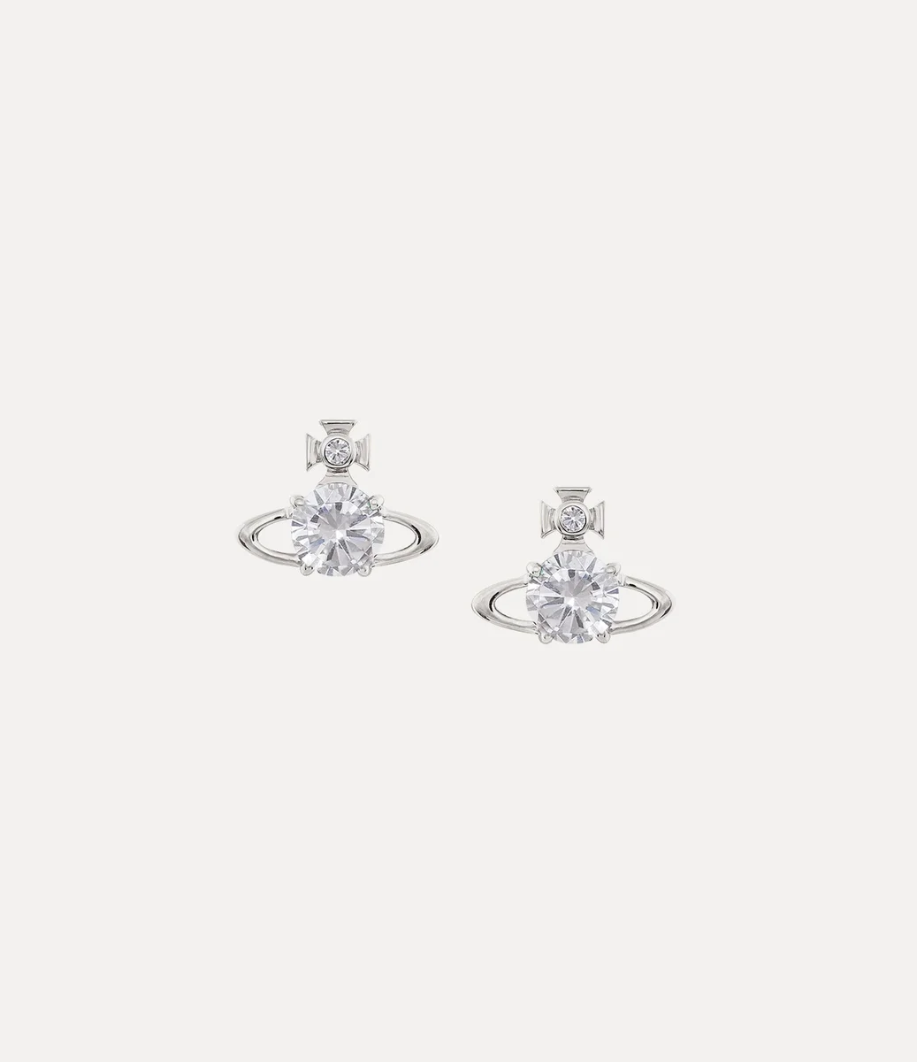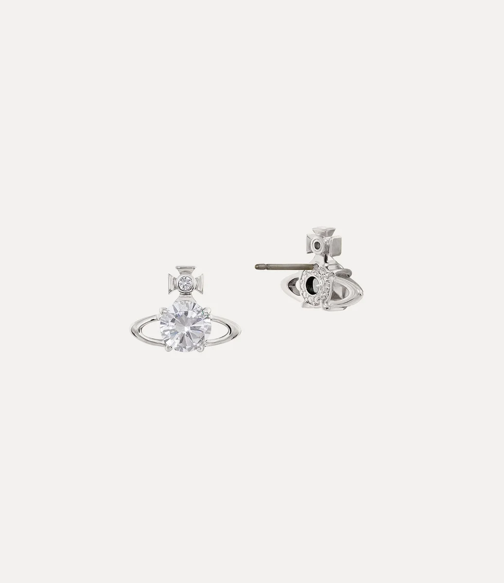 Los aretes Reina en tono plateado presentan una silueta en forma de esfera, que encarna la visión de Vivienne de fusionar la tradición con el futuro. Adornados con brillantes cristales de tono blanco en la parte superior y central de la cruz, su delicado diseño se sujeta con un cierre de pasador.