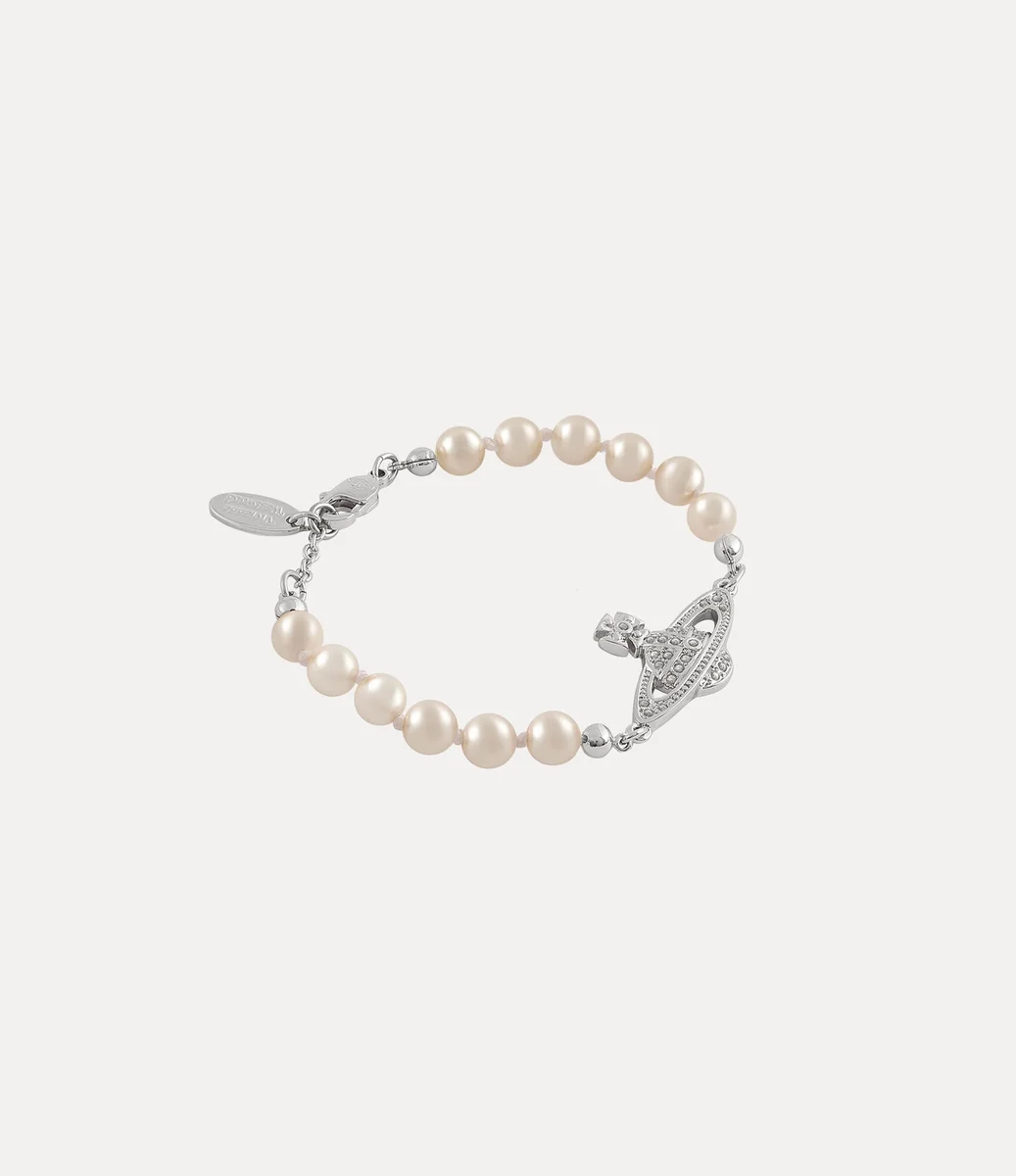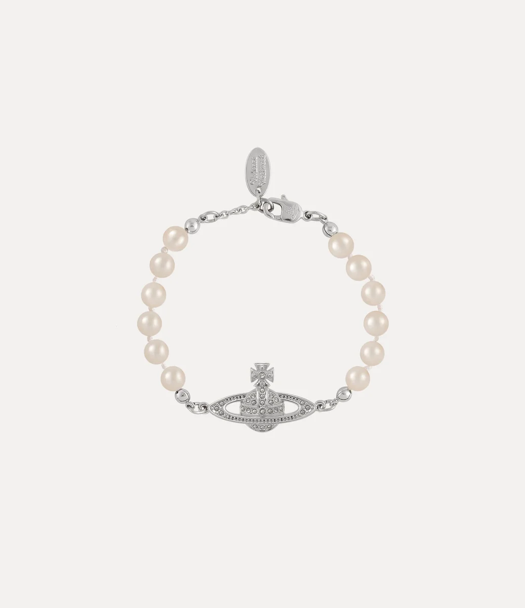 Las perlas son un elemento clave en la imaginería de la casa, ya que simbolizan el lujo y la rebeldía. La pulsera Mini Bas Relief Pearl presenta una fila de perlas de cristal, adornadas con un motivo de esfera con incrustaciones de cristal en el centro del diseño, sinónimo de la visión de Vivienne de llevar la tradición hacia el futuro.