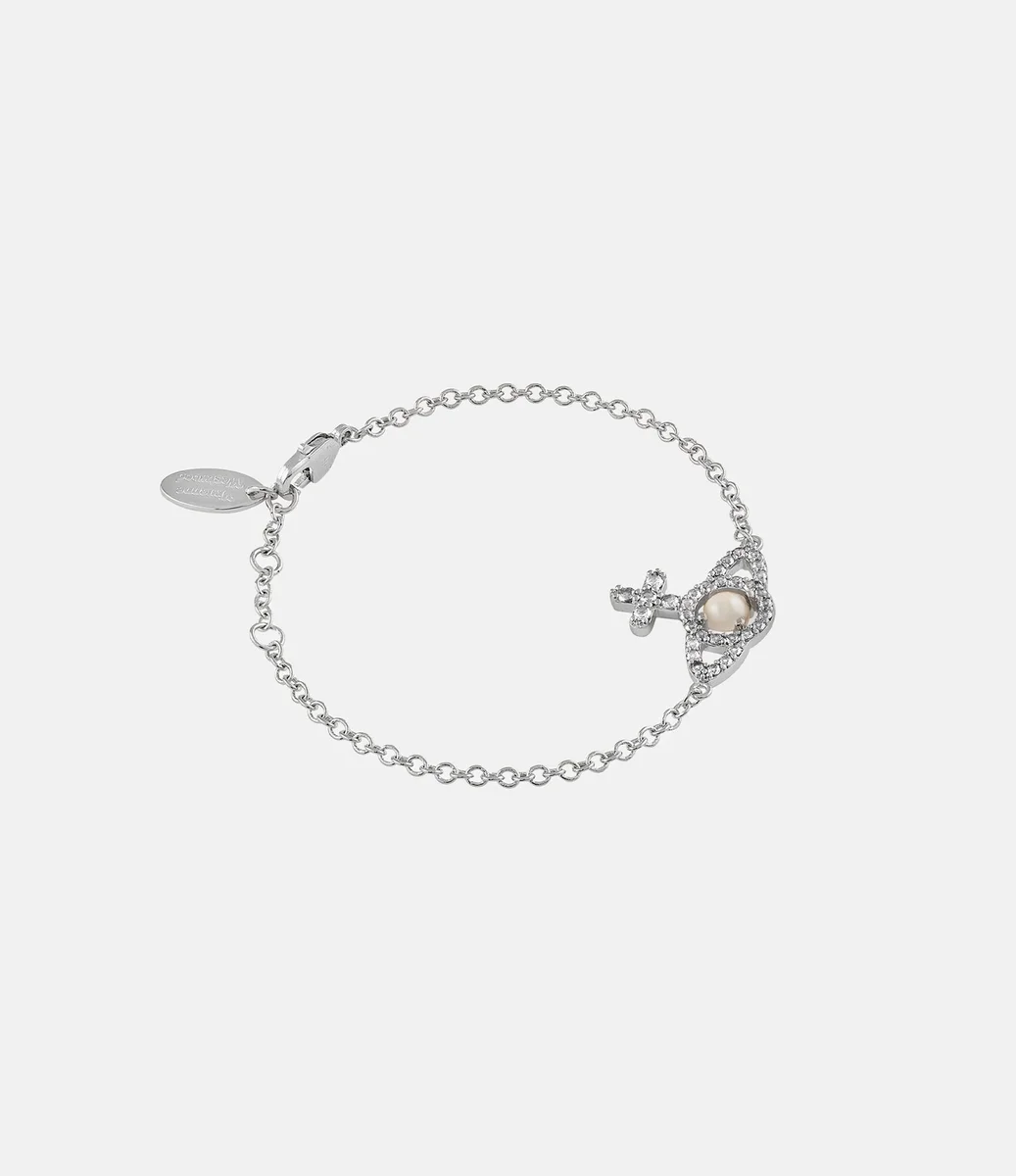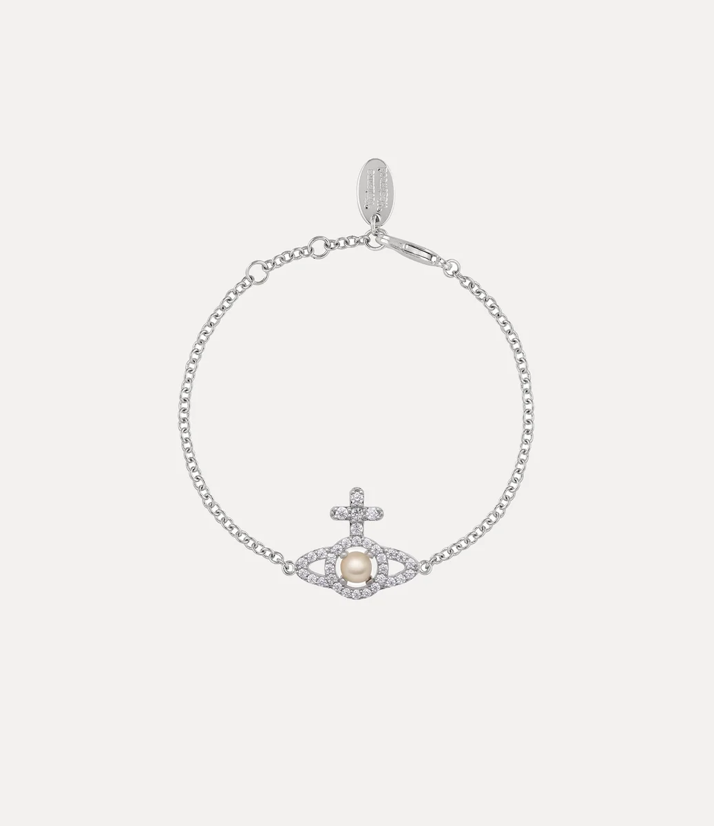 El colgante esférico de la pulsera Olympia Pearl Chain encarna la visión de Vivienne de llevar la tradición al futuro. El icónico diseño esférico se acentúa con detalles de cristal blanco, complementados con una brillante perla de vidrio en el centro de la pieza.