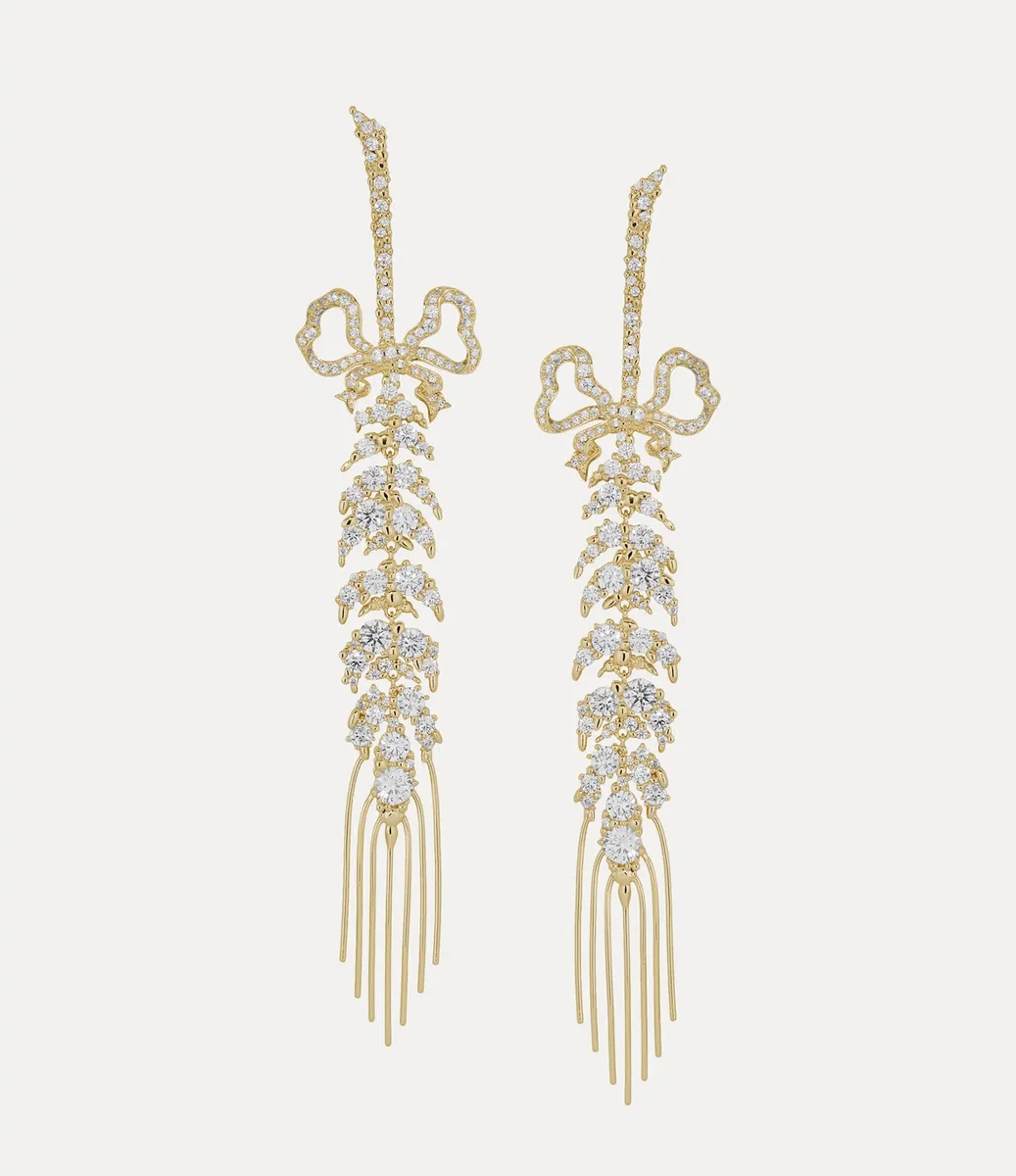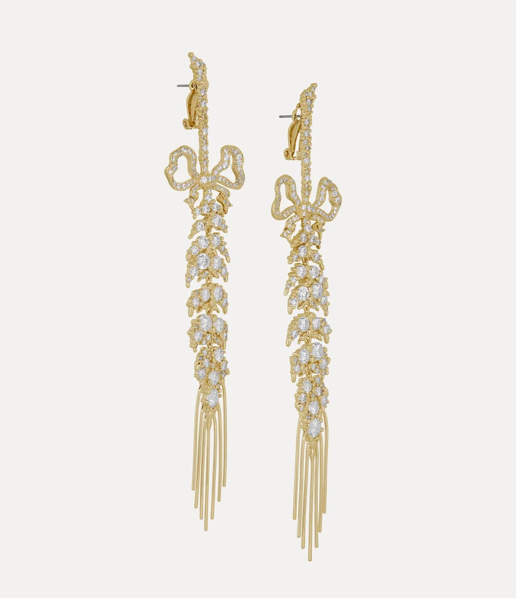 Los aretes Chloris se inspiran en la mitología griega y presentan una intrincada silueta en forma de gota centrada en un delicado motivo de trigo, símbolo atemporal de prosperidad, fertilidad y abundancia. El diseño, que incorpora la forma de lazo característica de la casa, que recuerda a las joyas georgianas, está adornado con brillantes cristales engastados en pavé.