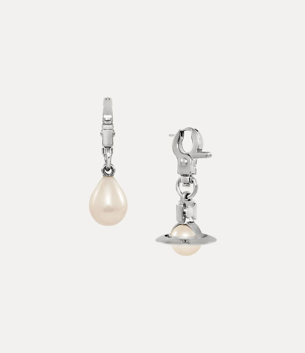 Nuestros aretes Claude presentan un diseño asimétrico, realzado por un baño plateado. Adornados con una esfera colgante totalmente metálica, que simboliza la visión de Vivienne de fusionar la tradición con el futuro, estos aretes se realzan aún más con una clásica perla en forma de gota, suspendida de un distintivo broche giratorio inspirado en la ferretería.