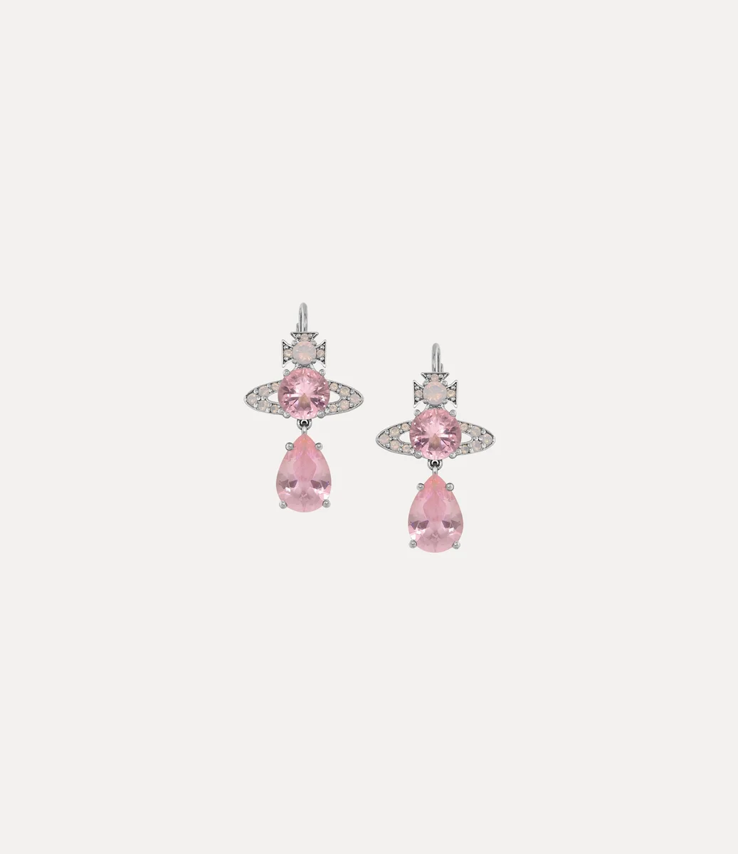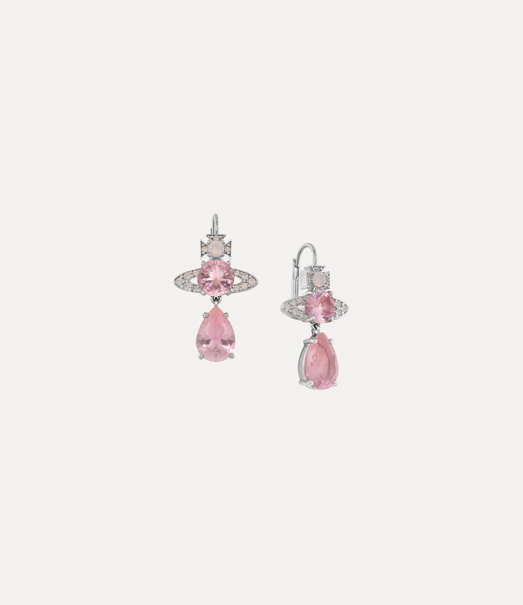 Nuestros aretes Ismene Drop están elaborados en metal plateado, con una gema rosa facetada en el centro de cada esfera y una piedra en forma de lágrima suspendida debajo. El anillo Saturno está adornado con delicados cristales rosas, mientras que la cruz de la parte superior está decorada con una gema lechosa e iridiscente.