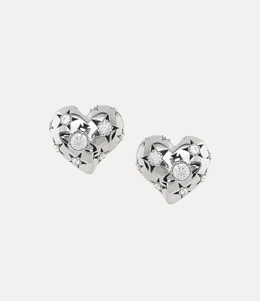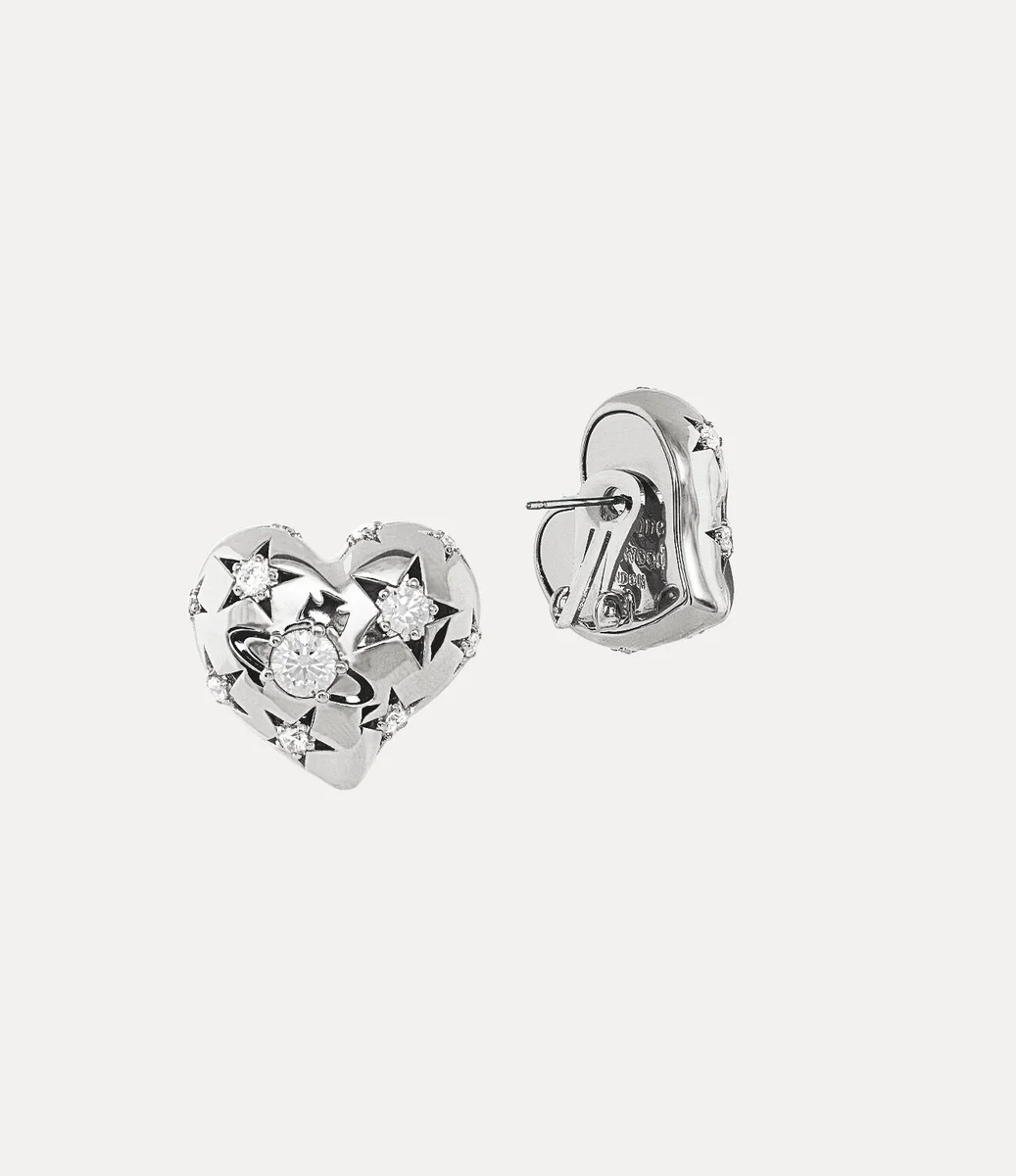 Nuestros aretes Lee Clip en tono plateado reviven la iconografía característica de la casa, adornados con un clásico motivo asimétrico en forma de corazón. El diseño ofrece un aire de encanto celestial, con motivos de estrellas junto a la silueta central del orbe, inspirada en nuestro motivo en forma de orbe, que recuerda la visión de Vivienne de llevar la tradición hacia el futuro.