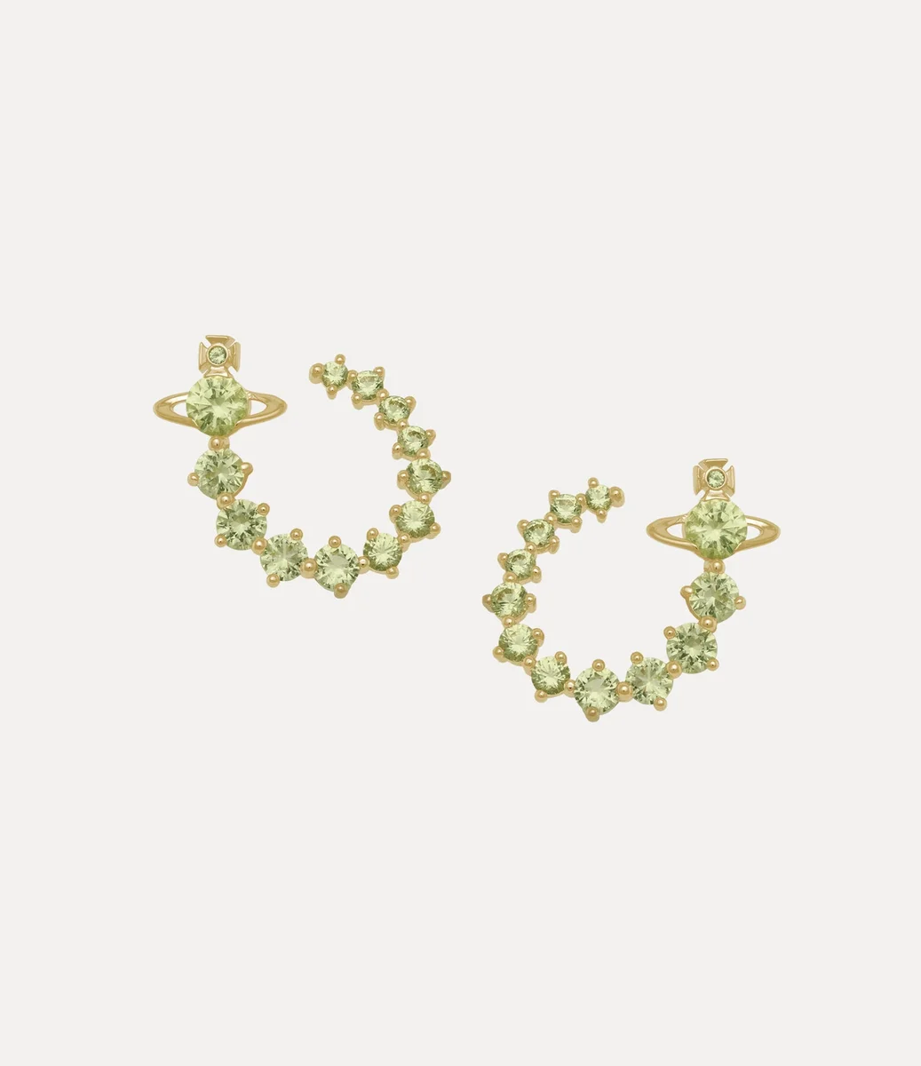 Fabricados en chapado dorado pulido, nuestros aretes Lydia se curvan suavemente alrededor del lóbulo de la oreja para crear la ilusión de un aro escultural. Adornados con piedras de circonita cúbica que se estrechan elegantemente en tamaño, el diseño está adornado con nuestro emblema orbital atemporal, que recuerda la visión de Vivienne de llevar la tradición al futuro.