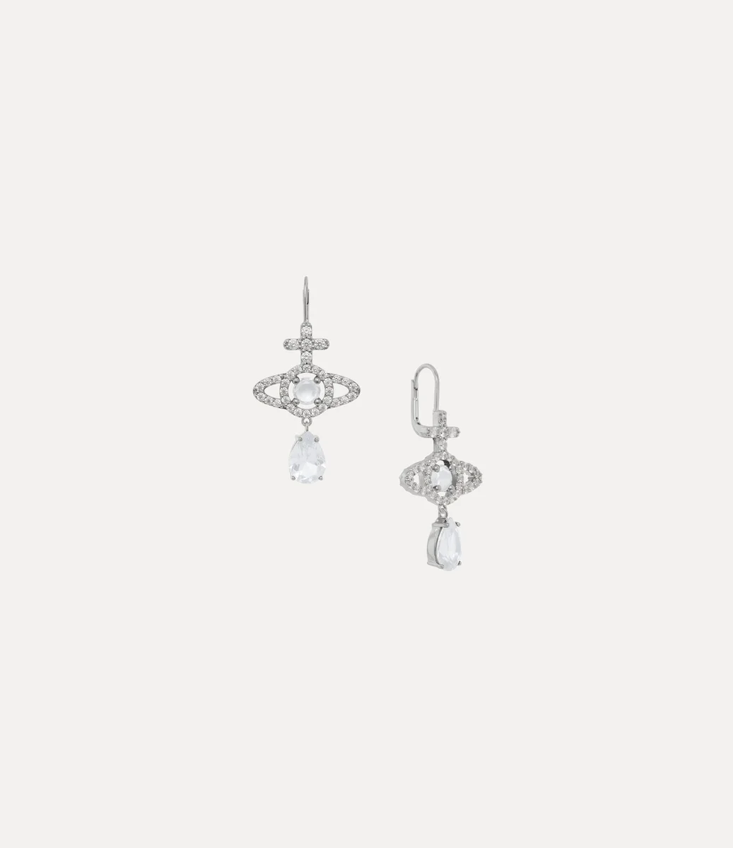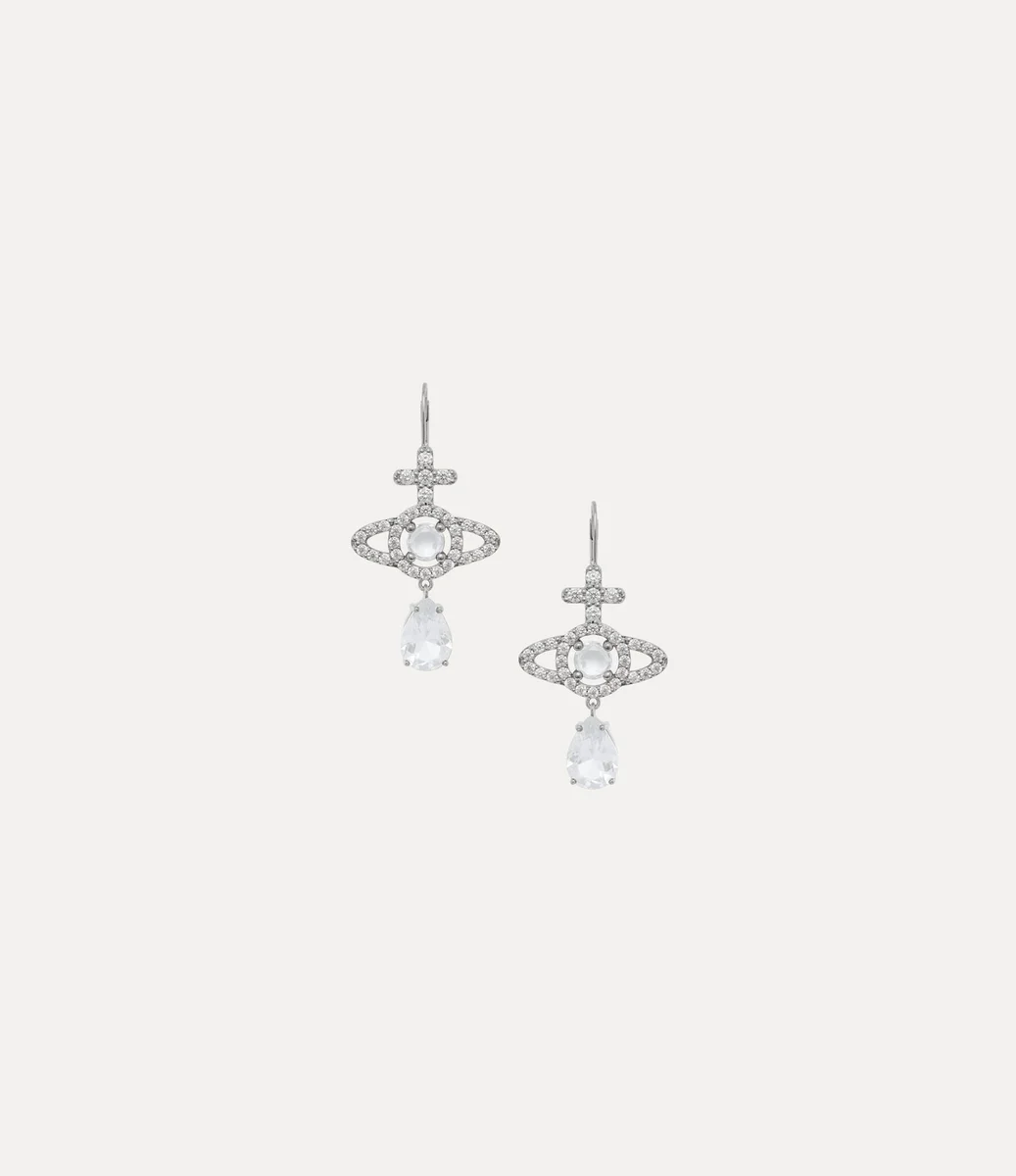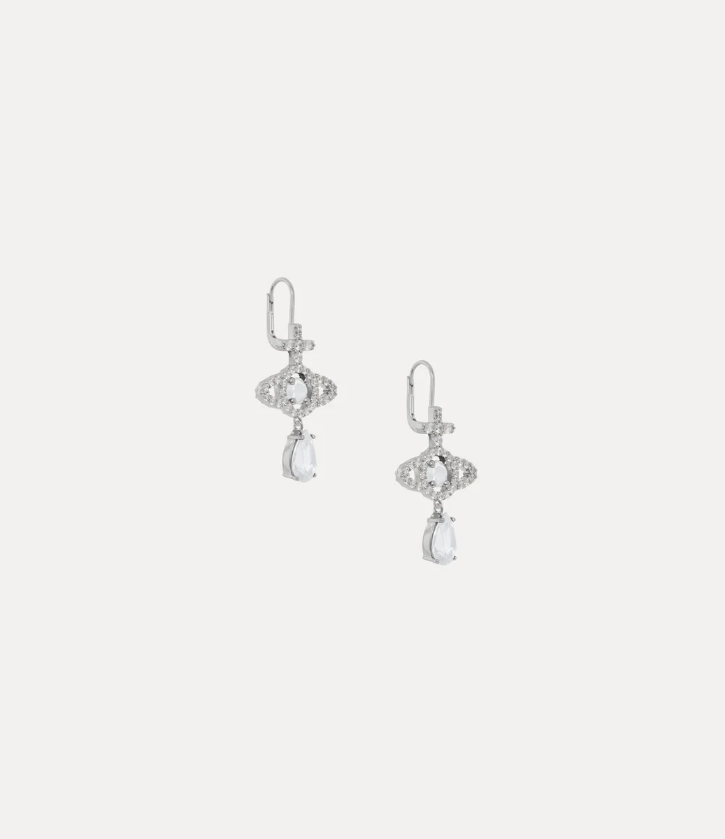 Los aretes Olympia Drop reinterpretan la silueta esférica característica de la casa con un cristal en forma de lágrima suspendido. El diseño presenta una piedra central blanca rodeada de brillantes cristales engastados en pavé, con un acabado plateado.