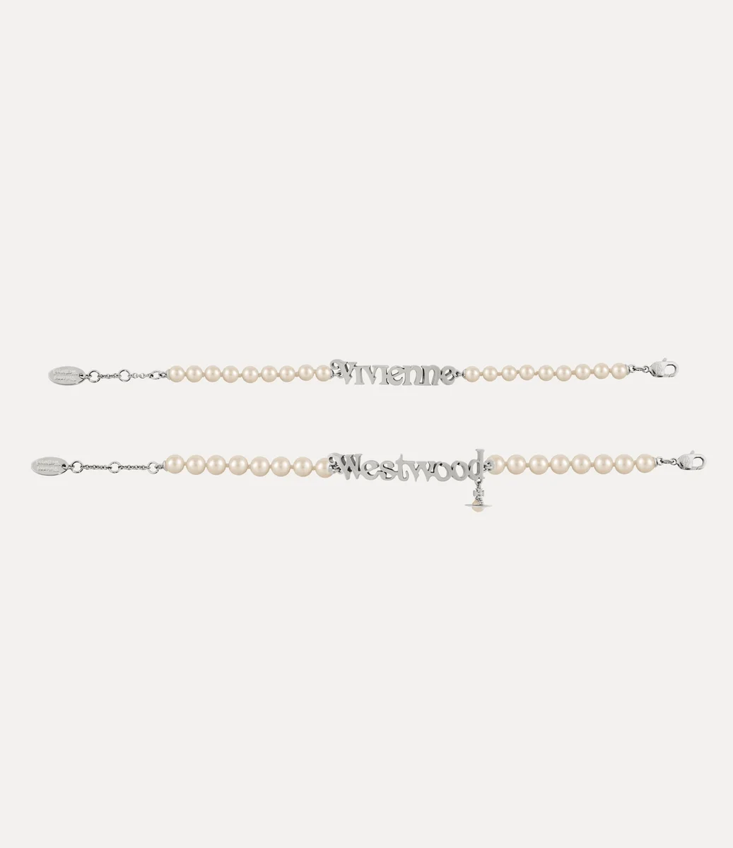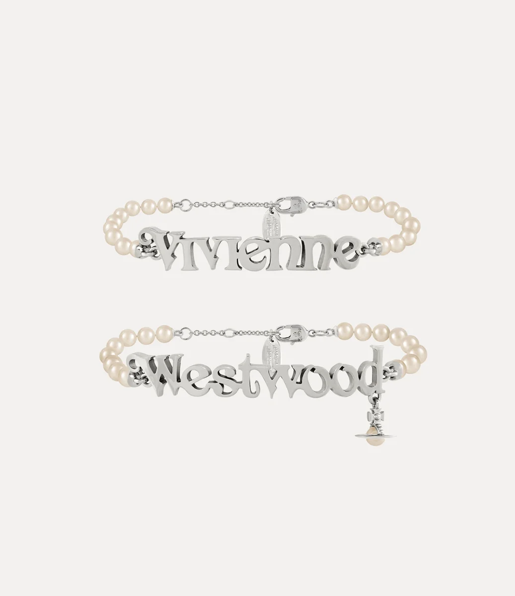 La pulsera Amelia presenta las palabras «Vivienne» y «Westwood» en la tipografía característica de la casa, con un acabado plateado. El diseño cuenta con un cordón de perlas de cristal y un colgante en forma de esfera en el cierre, que refleja la filosofía de lanzar el pasado hacia el futuro.