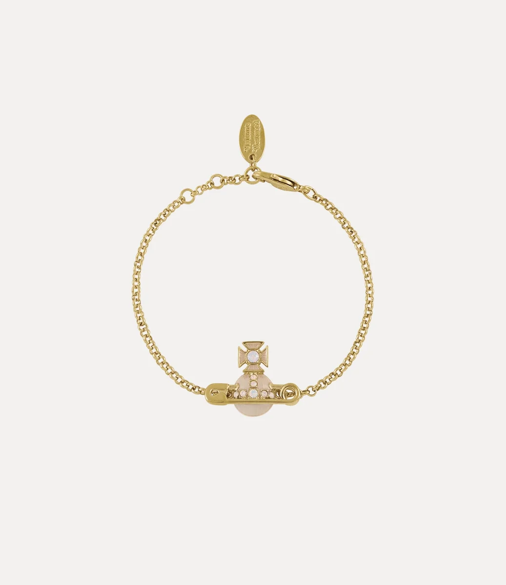 Nuestra pulsera Kitty se reinventa esta temporada con un baño pulido en tono dorado y detalles clásicos. El motivo central en forma de esfera está realzado con esmalte translúcido pintado a mano y perforado con un clásico motivo de imperdible, en referencia a la estética punk característica de Vivienne.