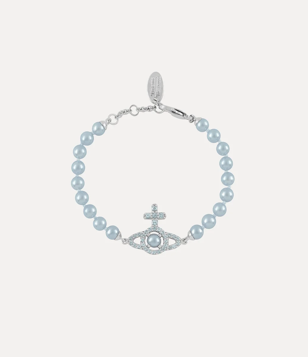 Las perlas siguen siendo un elemento esencial de la iconografía de la casa, emulando una sensación de lujo pasado. La pulsera Olympia Pearl está compuesta por perlas azules con base de vidrio y tiene en el centro nuestro característico orbe plateado, intrincadamente adornado con cristales engastados en pavé.