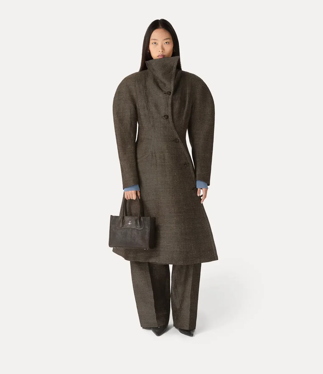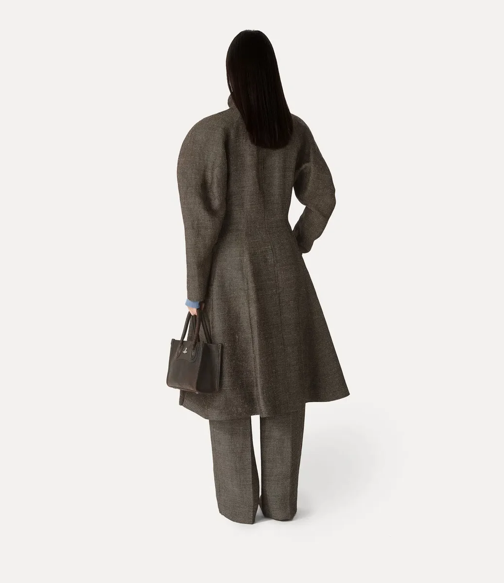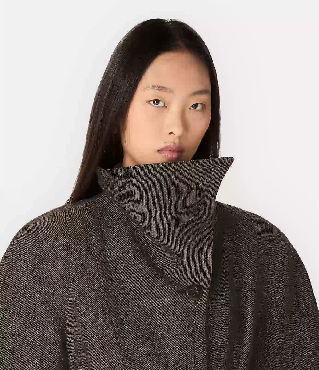 El abrigo Breeze está confeccionado en sarga de lino y algodón con una textura suave similar a la franela que le confiere un aspecto rústico y vintage. Con un atrevido corte asimétrico, la prenda presenta una fila de botones descentrados que abrochan el frente cruzado, esculpiendo la cintura antes de caer en un sutil dobladillo acampanado.