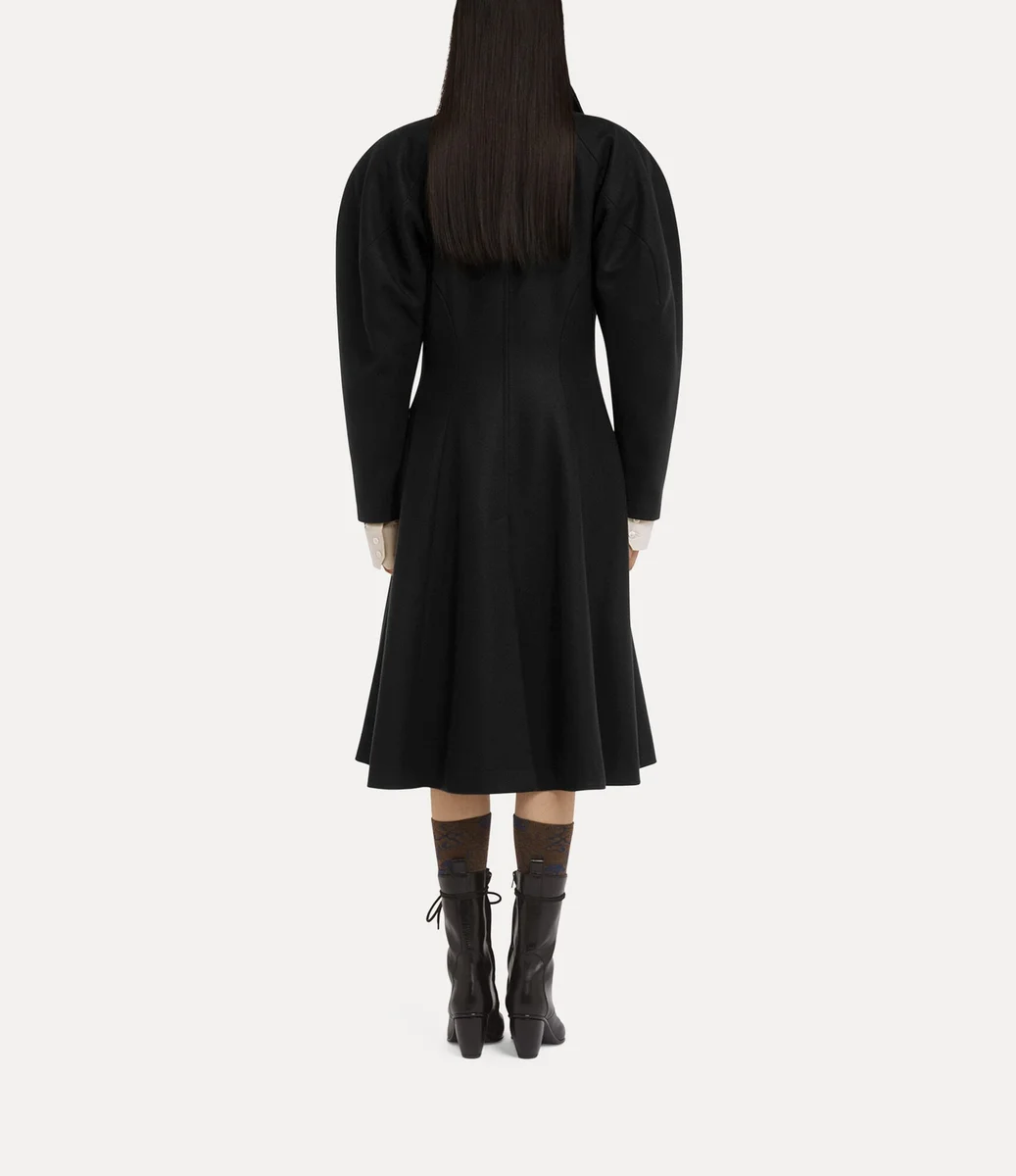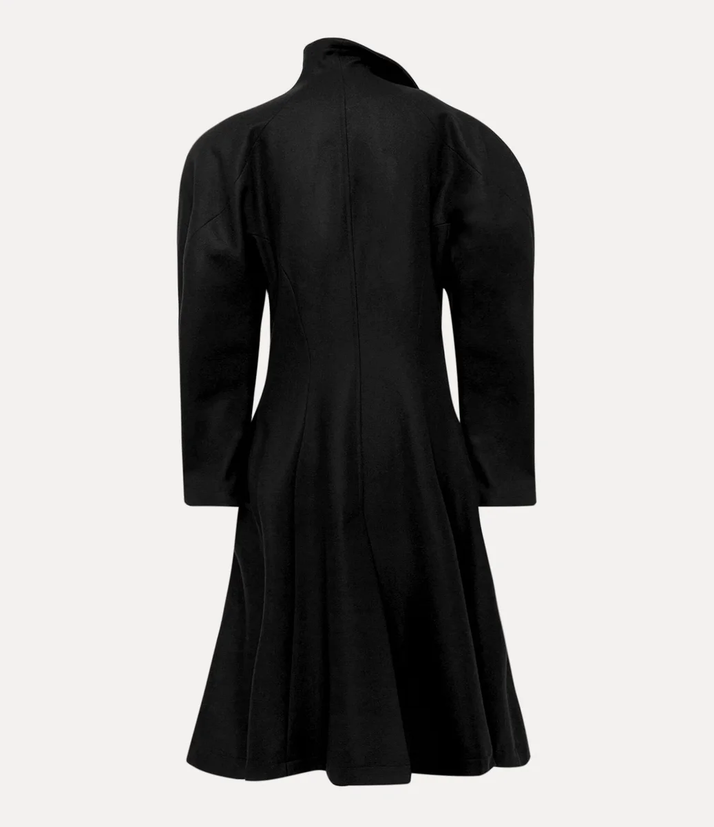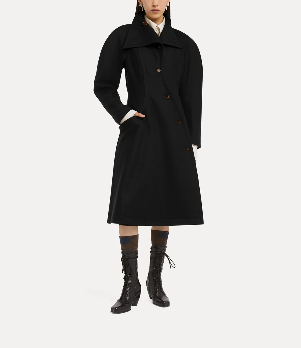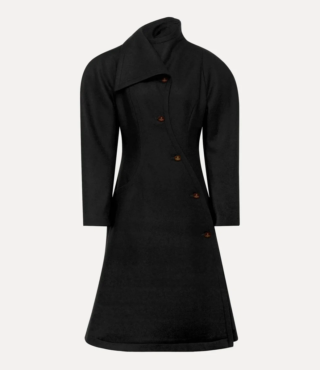 El abrigo Breeze presenta un frente asimétrico de botonadura sencilla, abrochado con botones ovalados grabados con el delicado motivo «Line Orb», un guiño a la visión de Vivienne de fusionar la tradición con el futuro. Confeccionado en una mezcla de lana y cachemira, el abrigo incluye hombros redondeados exagerados, una cintura marcadamente contorneada y un dobladillo acampanado, lo que crea una silueta entallada.