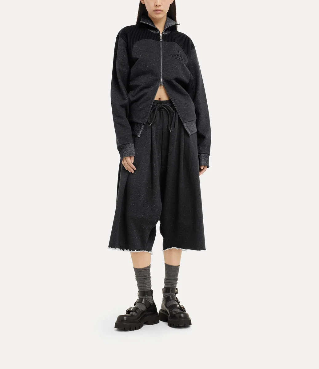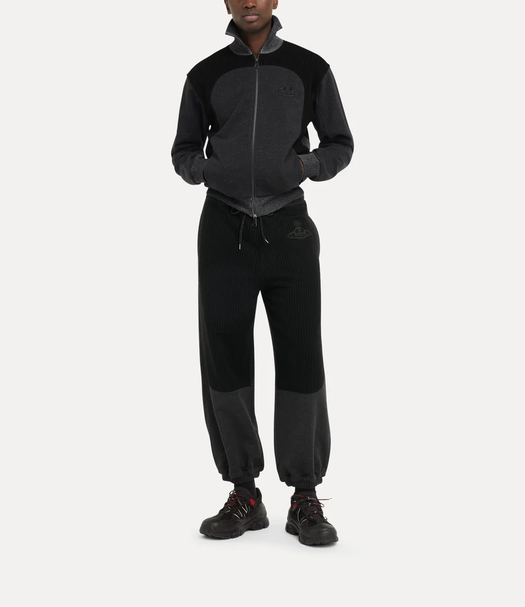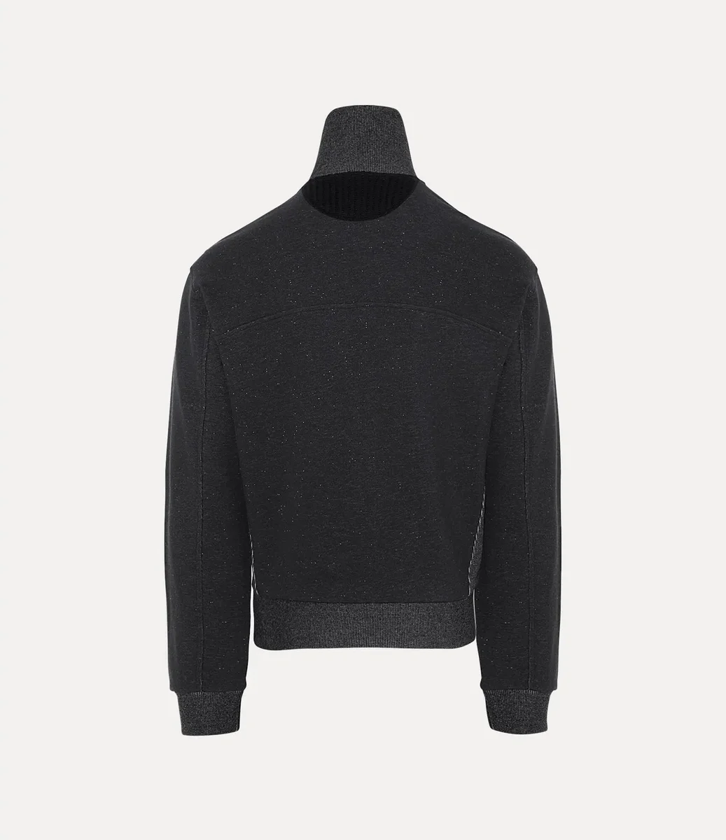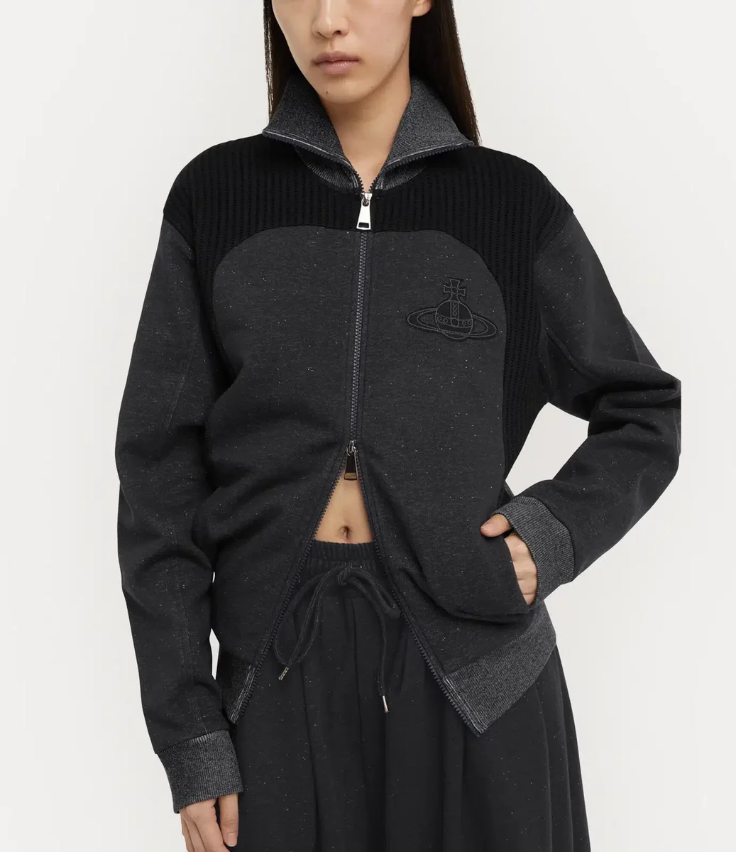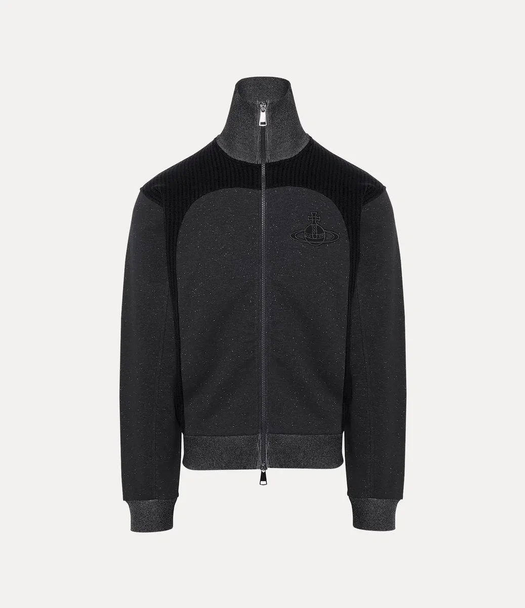 La chaqueta Alien Track de esta temporada reintroduce el cierre de cremallera bidireccional, un detalle que Vivienne Westwood utilizó por primera vez a finales de los años 70 y principios de los 80 como símbolo de inconformismo y sello distintivo de su estética punk rebelde. Con cuello alto y paneles acanalados en toda la prenda, la chaqueta está rematada con el motivo Graffiti Orb de la casa, sutilmente bordado en el pecho con hilo del mismo tono.