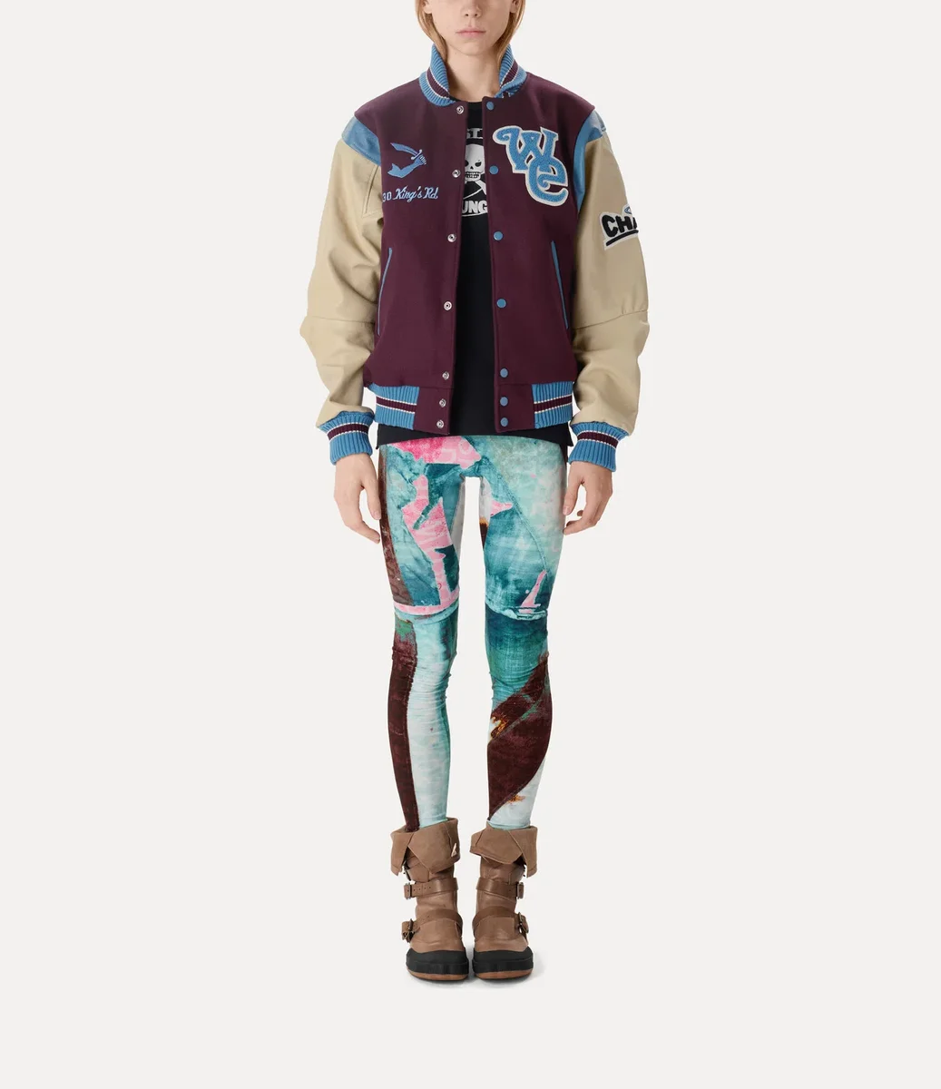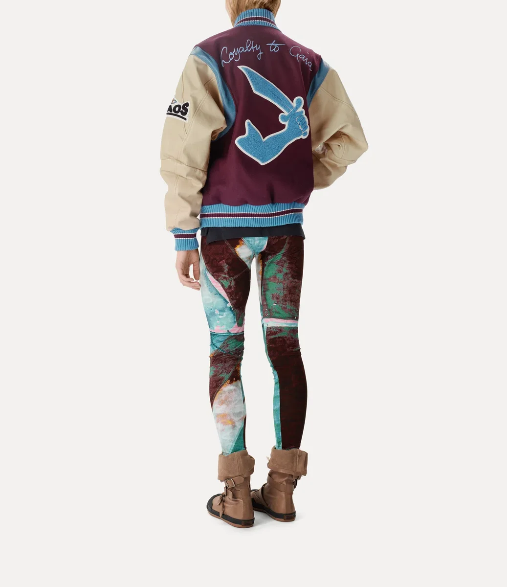 Nuestra chamarra Letterman Worlds End presenta una silueta inspirada en las chamarras bomber, con detalles de mangas de piel y ribetes acanalados en contraste. La parte delantera está adornada con un motivo de brazo y sable y la dirección de nuestra boutique Worlds End, mientras que la parte trasera muestra la frase «Loyalty to Gaia» (Lealtad a Gaia), en referencia al compromiso de Vivienne con el activismo climático.