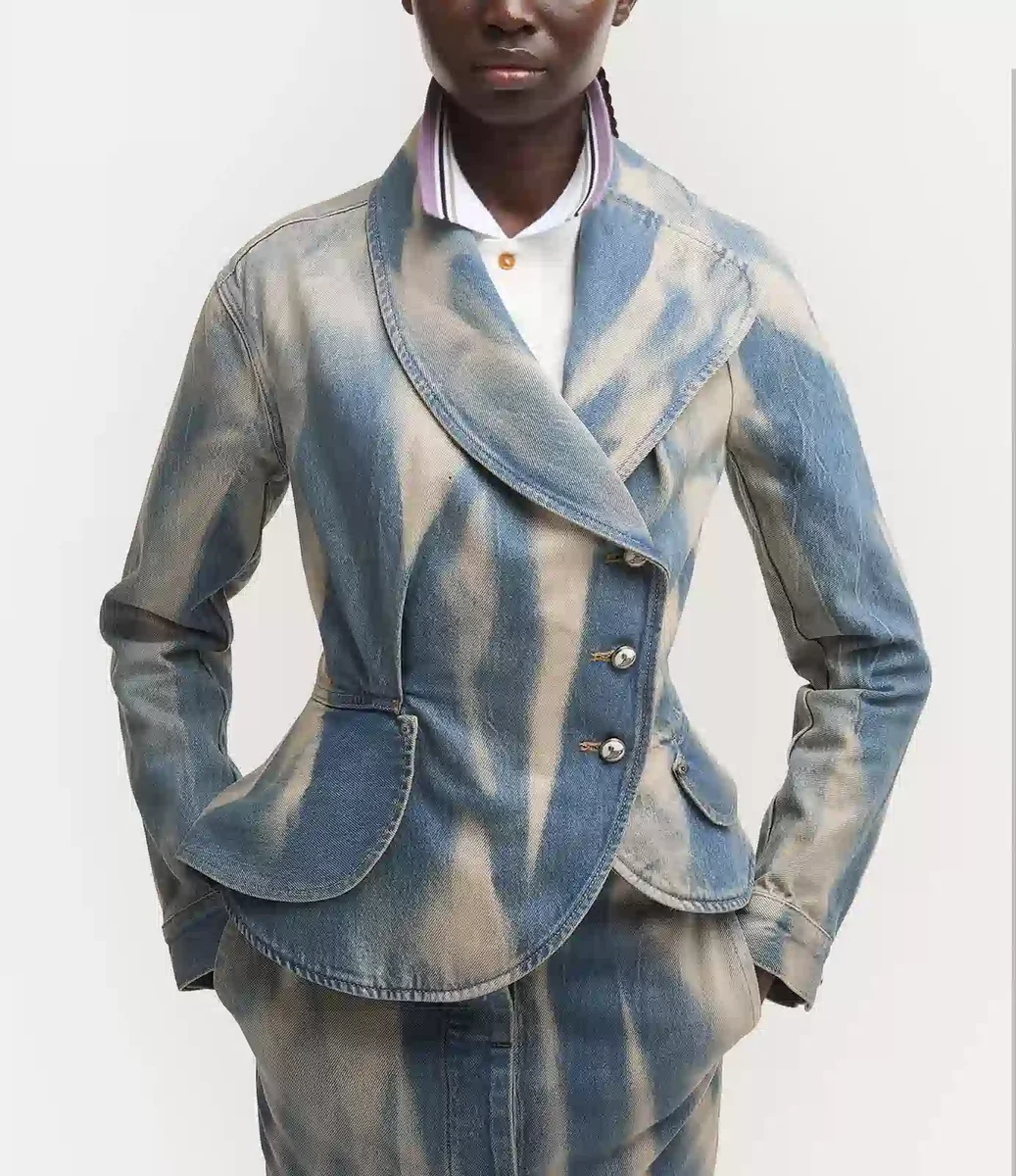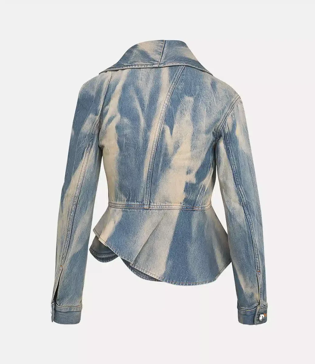 Confeccionada en suave algodón, nuestra chaqueta vaquera Stormy presenta un lavado decolorado y desgastado que le confiere un acabado vintage y desgastado. El diseño se caracteriza por su solapa asimétrica exagerada, que aporta un toque escultural al escote, mientras que la cintura marcadamente contorneada y el dobladillo acampanado crean una silueta definida y entallada.