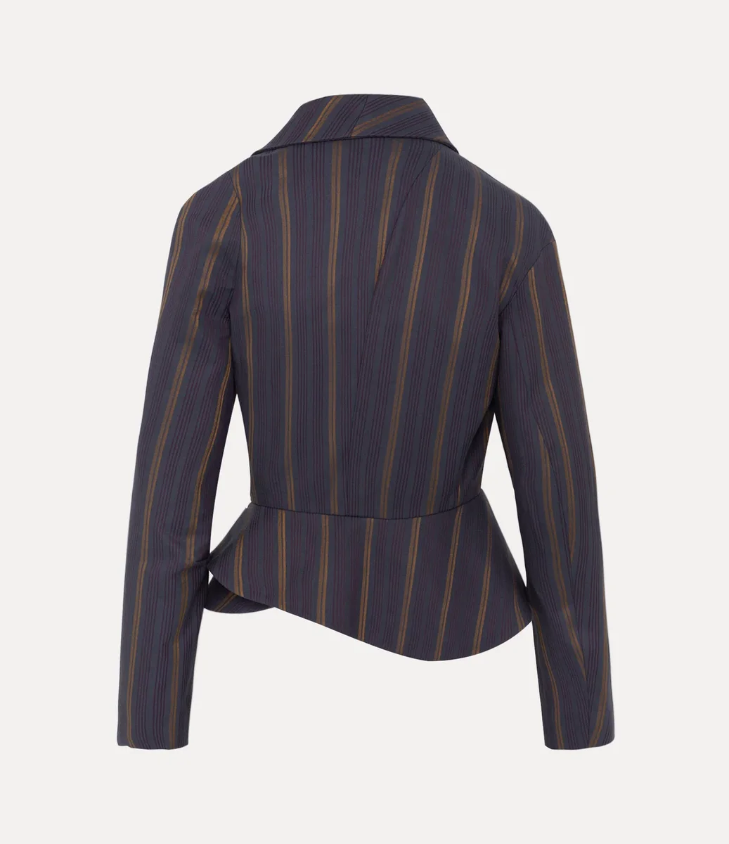 Confeccionada en una suave mezcla de algodón, nuestra chaqueta Stormy presenta un fondo azul marino con finas rayas verticales en dorado y burdeos, enmarcadas por un cuello chal drapeado. Las delicadas pinzas moldean la cintura, cayendo en un dobladillo peplum esculpido, mientras que un divertido motivo de «manchas de café» acentúa el interior.