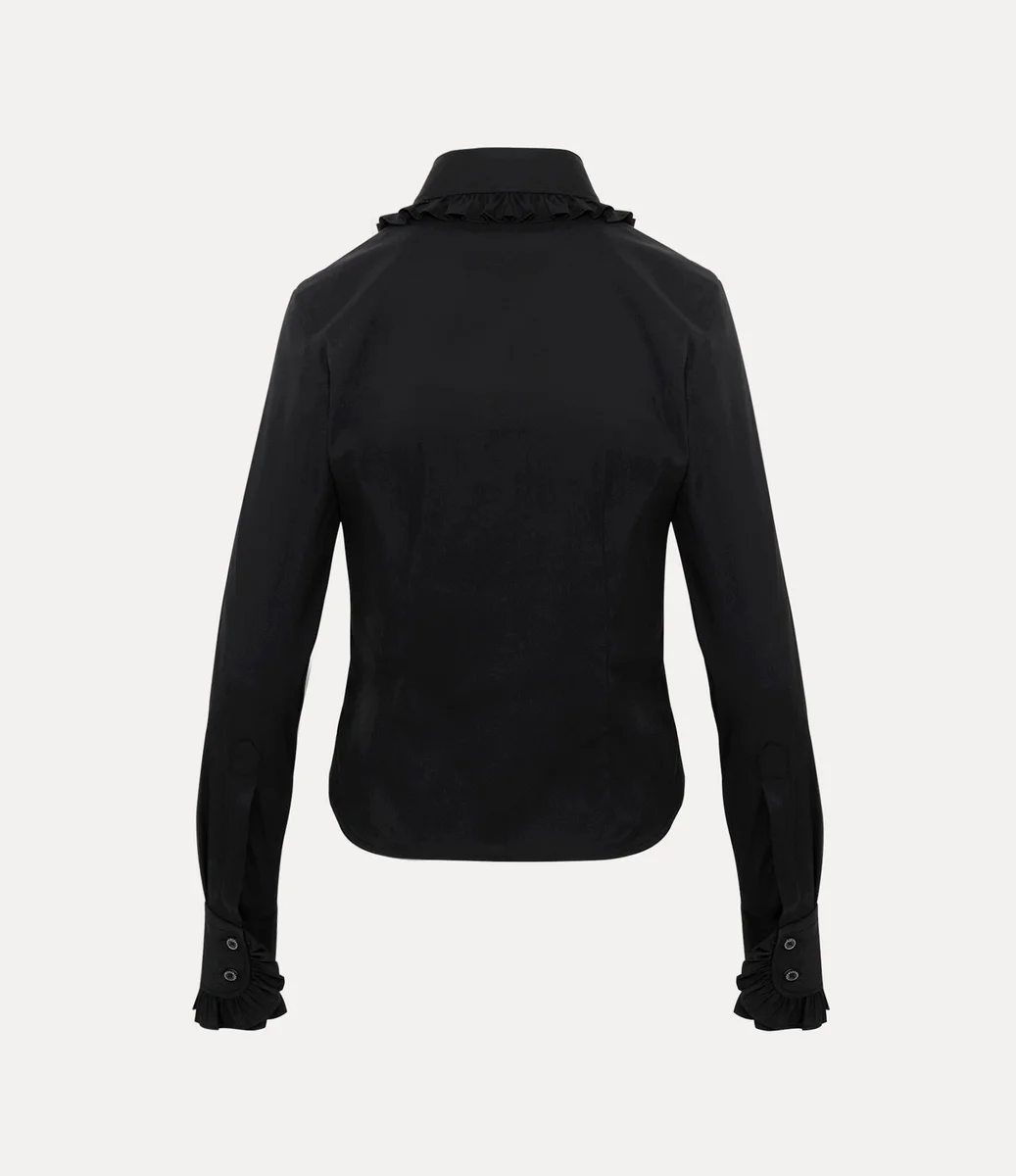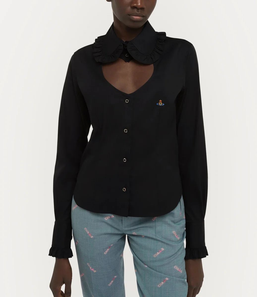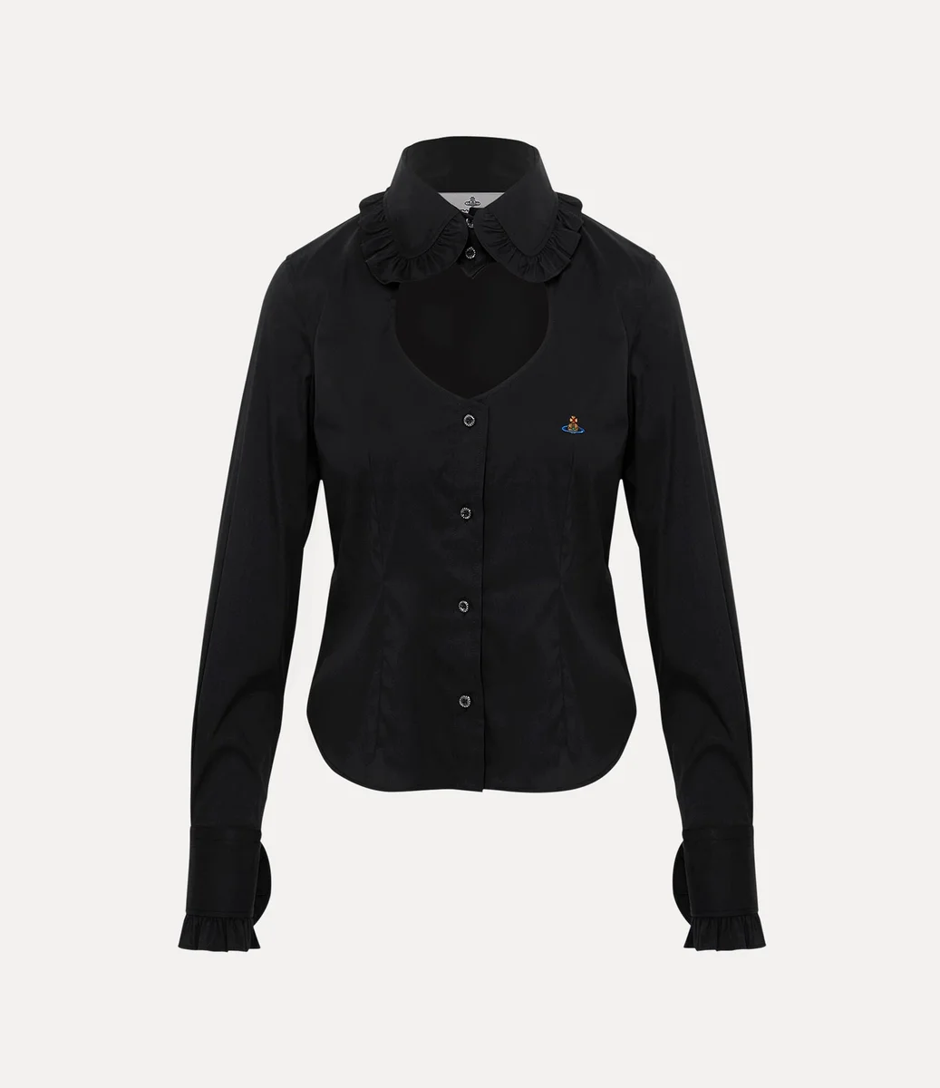 La camisa Toulouse Frill revive nuestro clásico corte en forma de corazón en el escote, sinónimo del afecto de Vivienne por la humanidad y el planeta. La prenda está rematada con nuestro característico bordado Orb en el pecho y cuenta con un cuello delicadamente redondeado, enmarcado con detalles de volantes fruncidos.