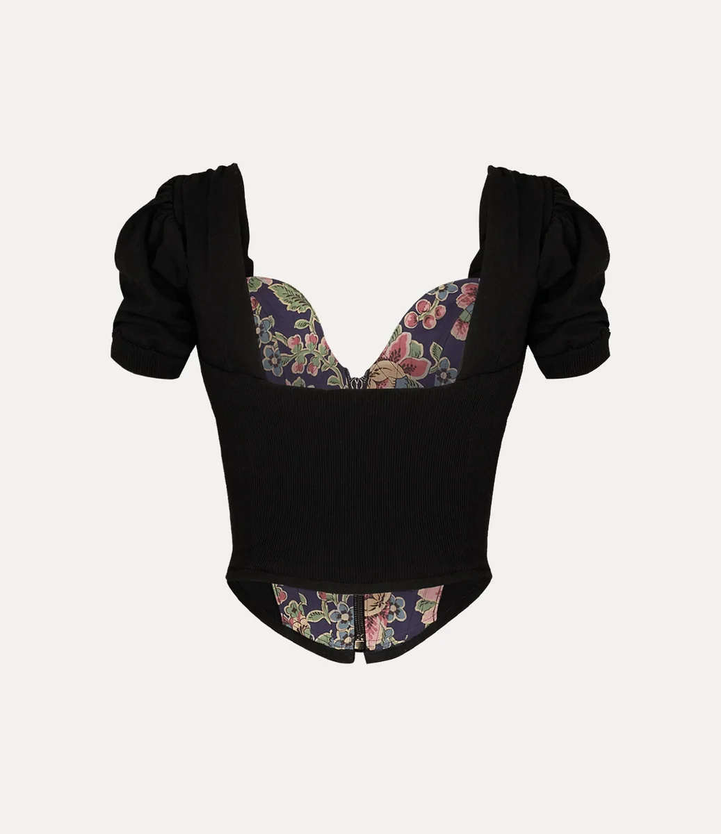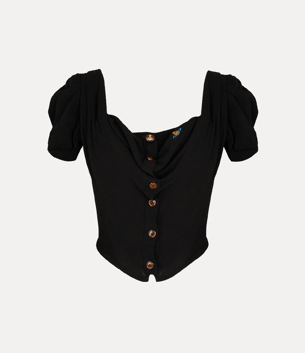 El cárdigan Bea Corset de manga corta presenta un delicado drapeado en el escote y los hombros, que cae en un corpiño estructurado con varillas y se abrocha con nuestros clásicos botones de color ámbar. El diseño está adornado con un orbe bordado multicolor en el pecho, que encarna la visión de Vivienne de lanzar la tradición hacia el futuro.