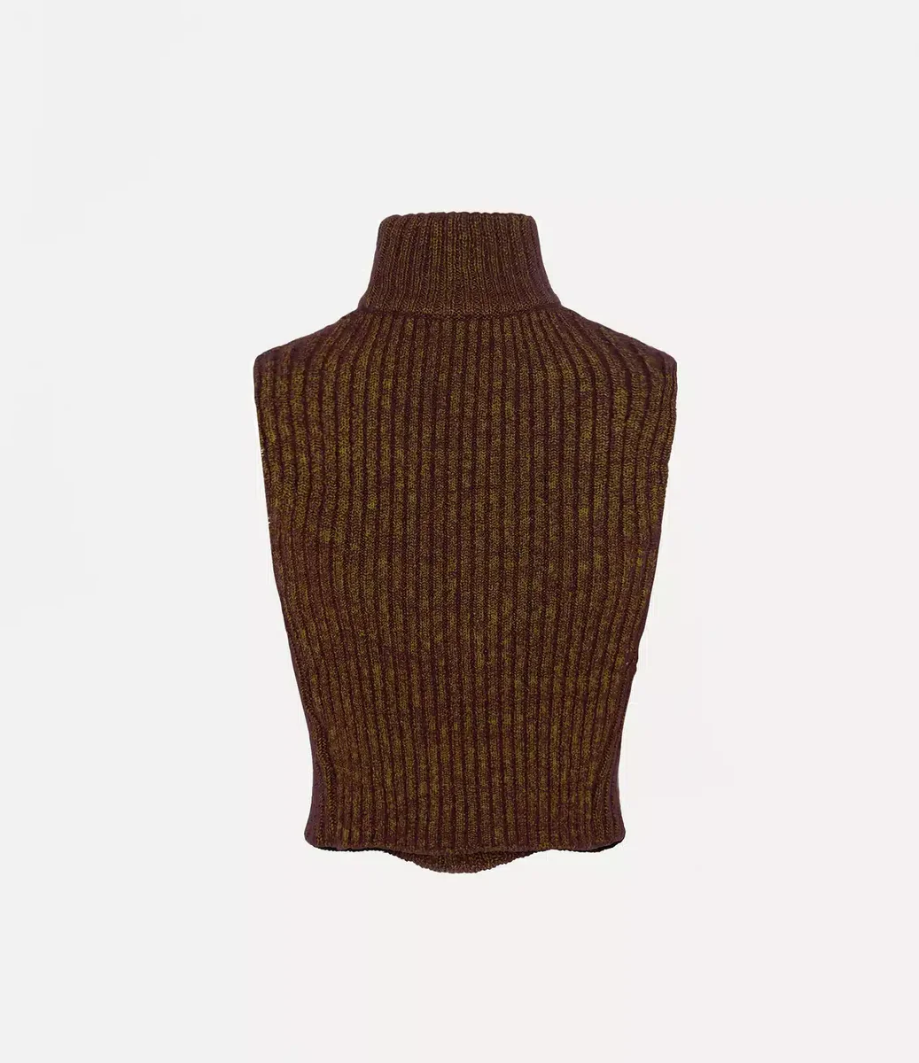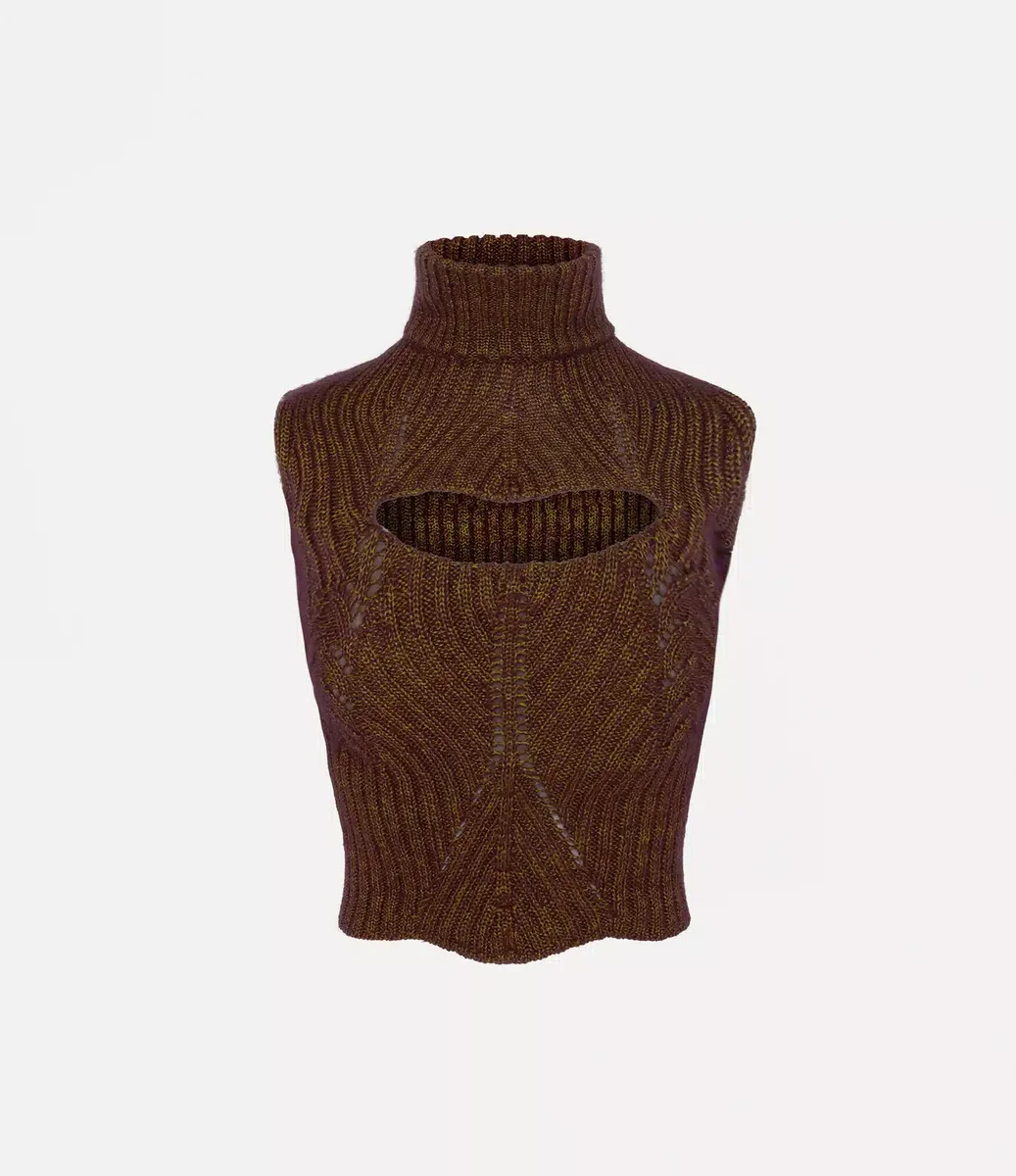 El top sin mangas Mary Corset está confeccionado en una mezcla de seda y mohair, combinando puntadas en espiga y punto elástico. Con una abertura horizontal sobre el pecho y un sujetador tipo corsé debajo de la capa de punto para mayor sujeción, el top está rematado con detalles acanalados a lo largo del cuello alto y en todo el diseño.