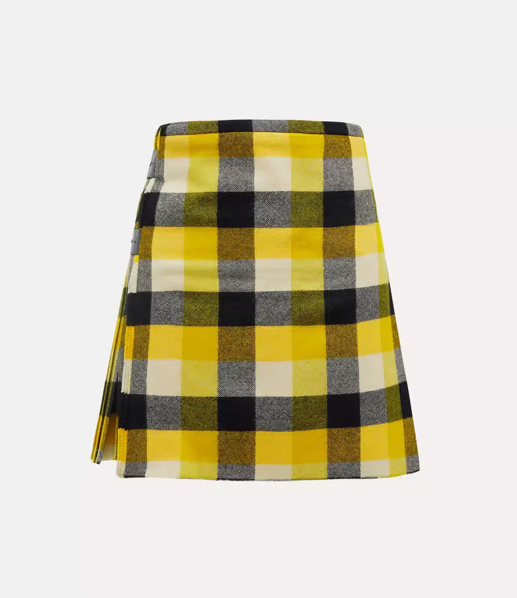 La minifalda kilt, una pieza emblemática de la casa, está confeccionada en lana y rediseñada con el vibrante motivo de cuadros «Pixel» de esta temporada. La silueta en forma de A presenta una cintura alta que fluye hacia un acabado plisado, con lengüetas ajustables con hebilla a cada lado para un ajuste a medida.