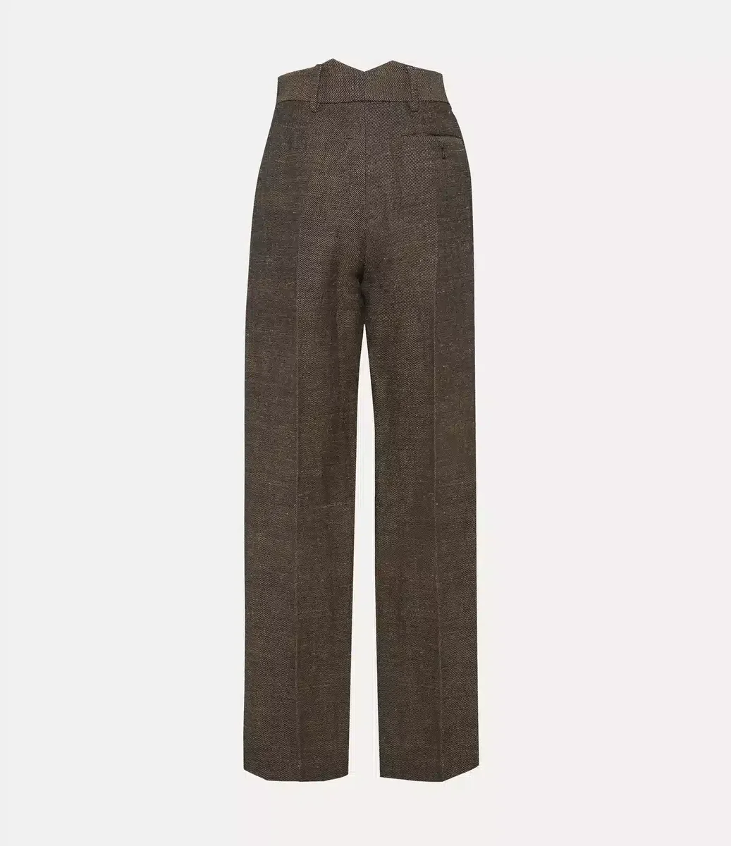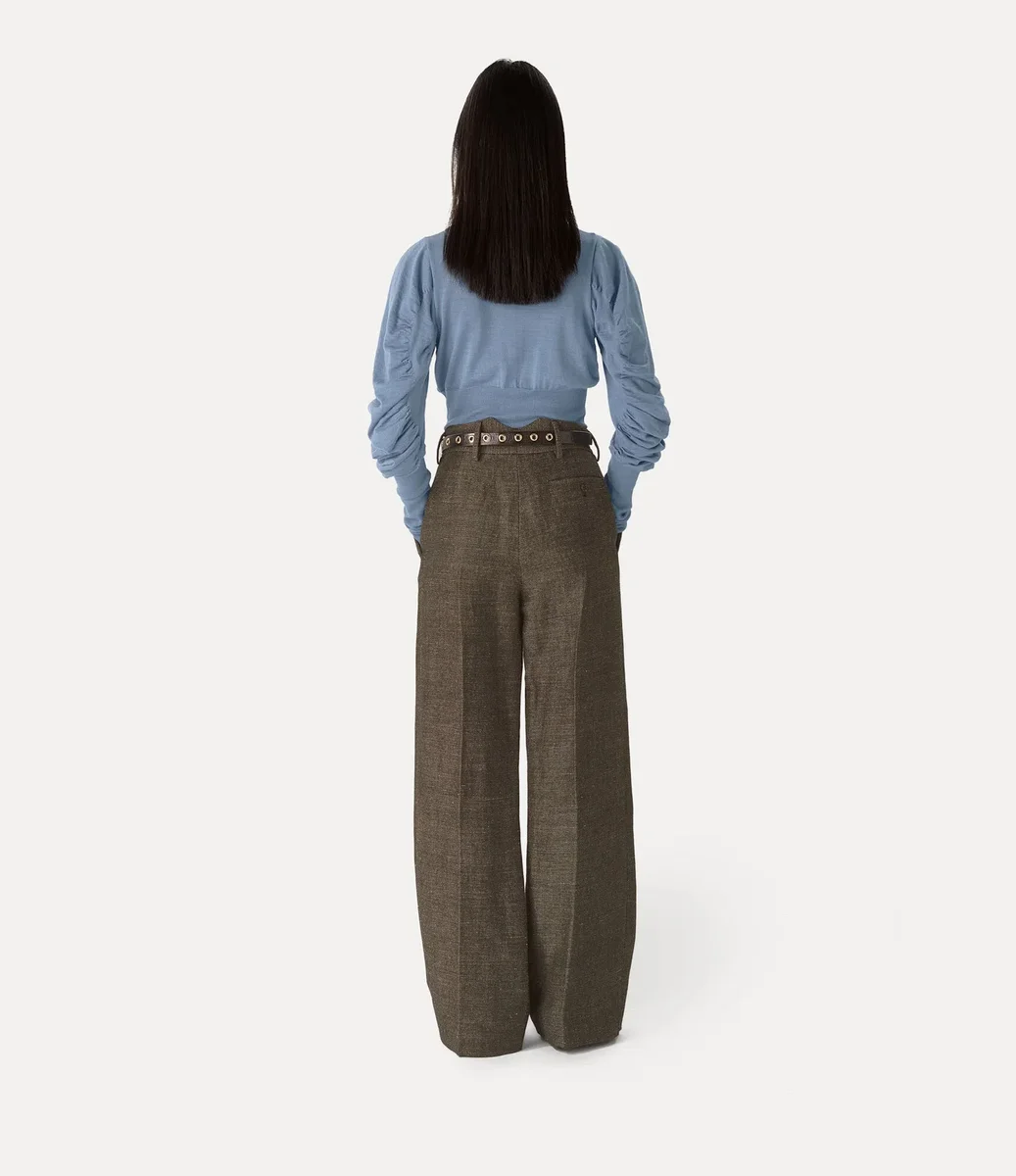 Nuestros pantalones Lauren de corte entallado se reinventan esta temporada en una rica mezcla de lino y lana. La silueta de pierna ancha se define por unos pliegues marcados que caen hasta un dobladillo limpio y recto. La característica lengüeta metálica con forma de esfera en la presilla delantera del cinturón completa el diseño, en un guiño al espíritu de la casa de impulsar el pasado hacia el futuro.