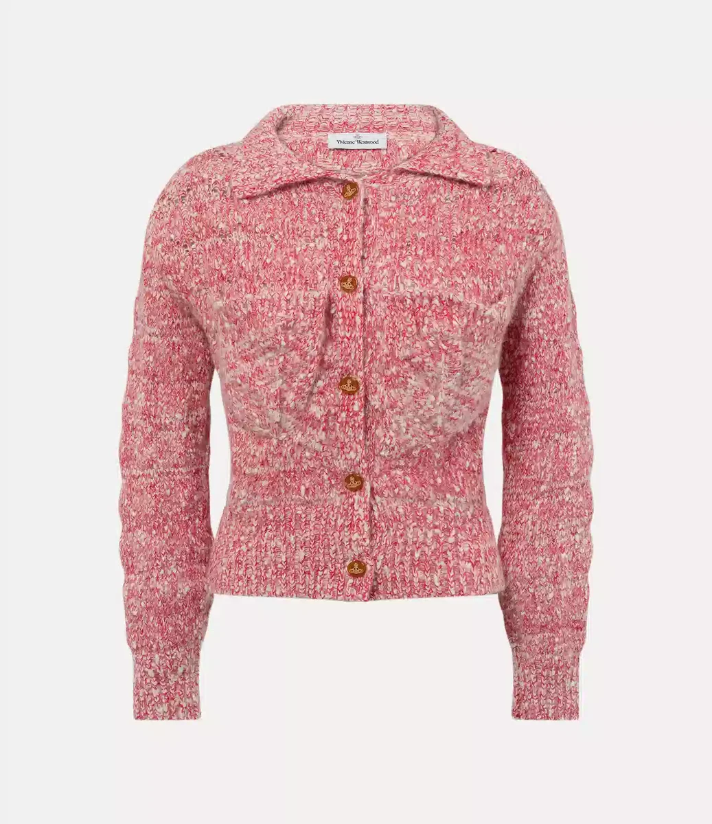 Nuestro cárdigan Arianna está confeccionado con un tejido grueso de algodón y mezcla de lana de alpaca, con un acabado jaspeado en rosa y blanco. Con un corte ajustado y una cintura definida, la prenda presenta un cuello en punta, ribetes acanalados y los característicos botones ovalados de la casa en la parte delantera.