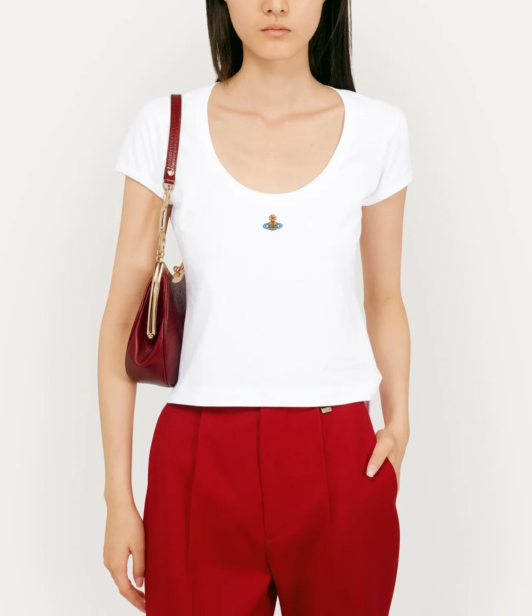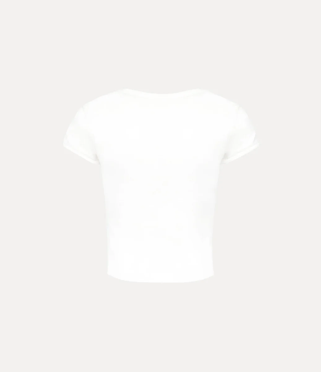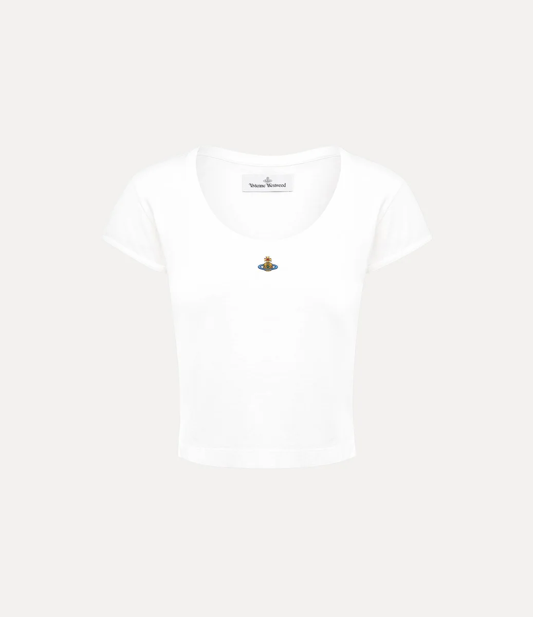 Nuestra camiseta Micro Lollo presenta un corte corto de algodón, con mangas cortas y escote redondo. La prenda lleva un bordado multicolor en forma de esfera en el centro del pecho, que simboliza la tradición, rodeado por los anillos celestes de Saturno, que representan el futuro.