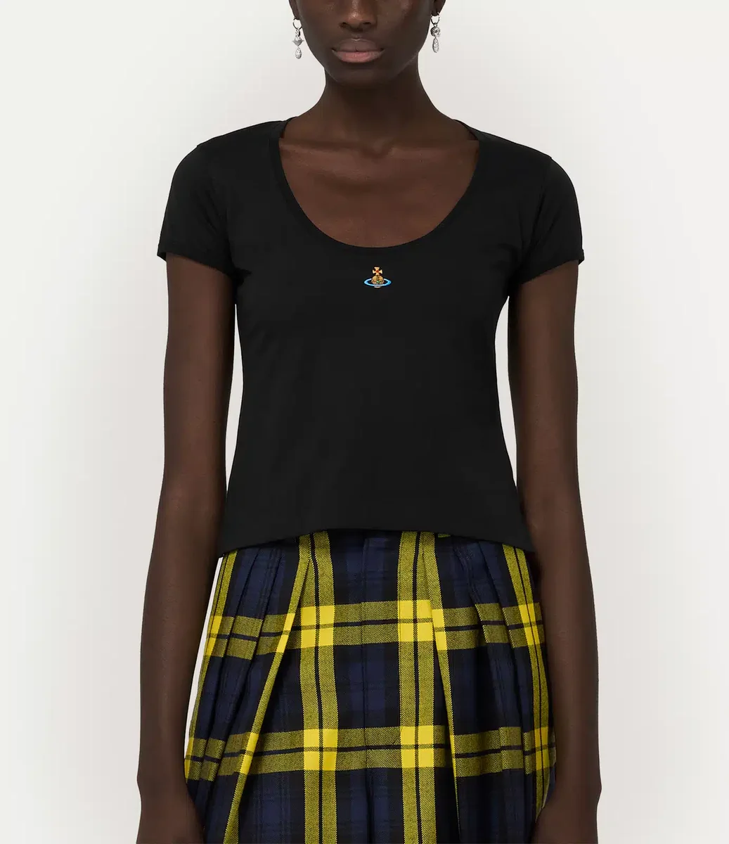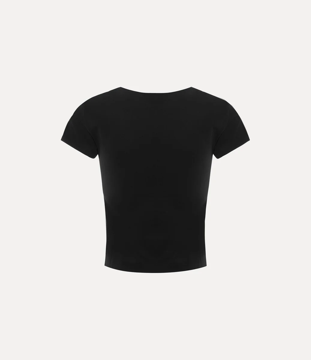 Nuestra camiseta Micro Lollo presenta un corte corto de algodón, con mangas cortas y escote redondo. La prenda luce un bordado multicolor en forma de esfera en el centro del pecho, que simboliza la tradición, rodeado por los anillos celestiales de Saturno, que representan el futuro.