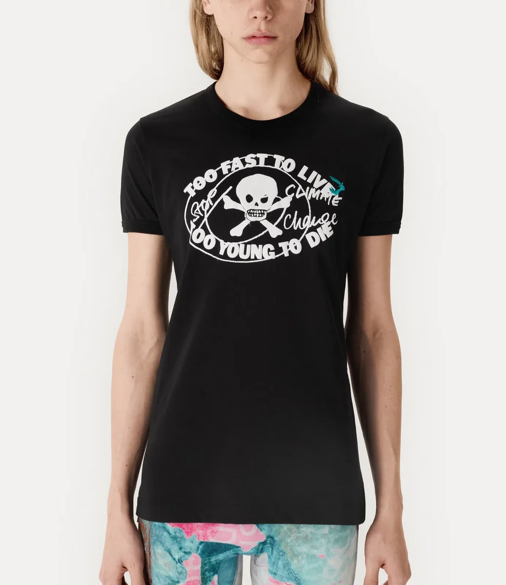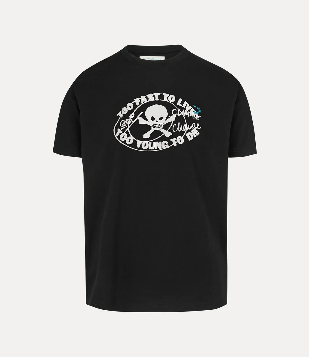 Nuestra camiseta Worlds End Classic está confeccionada en algodón ligero, con cuello redondo, manga corta y dobladillo recto. El diseño se completa con el eslogan «Too Fast to Live, Too Young to Die» (Demasiado rápido para vivir, demasiado joven para morir), tomado del letrero de nuestra emblemática boutique, ahora conocida como Worlds’ End.