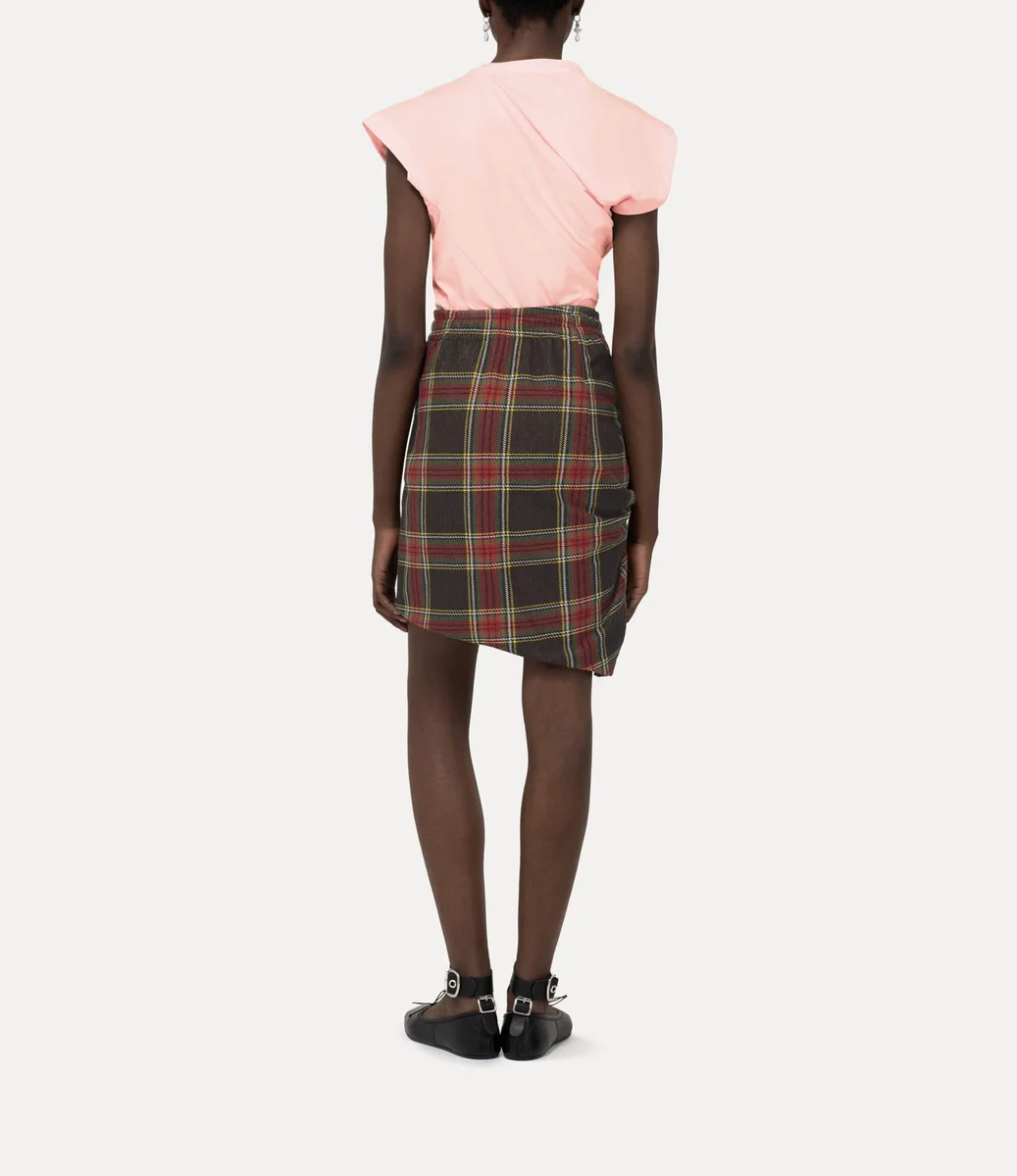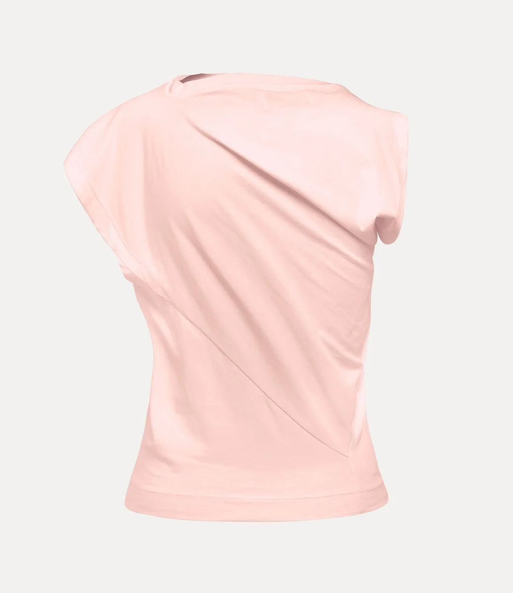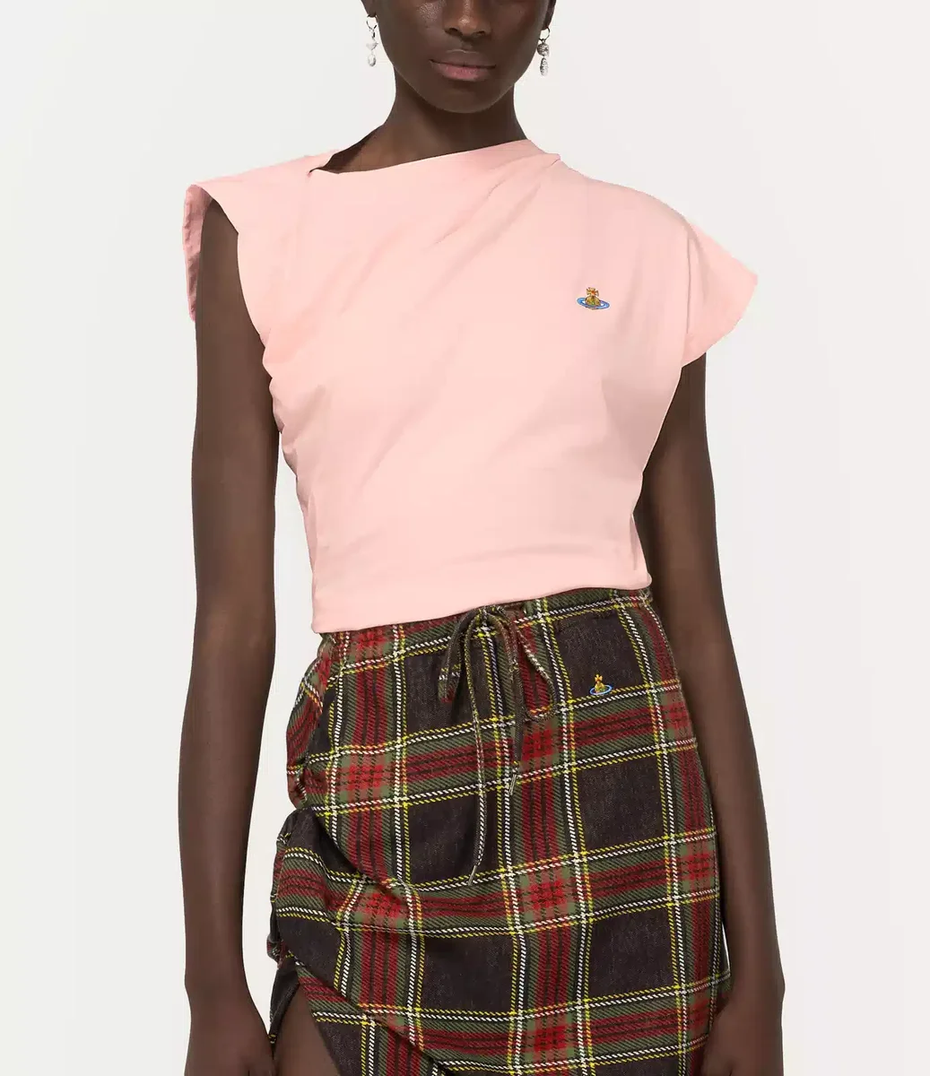 El top Hebo, emblemático de la casa, se ha actualizado y presenta esta temporada un suave acabado de algodón y un bordado en forma de orbe en el lado izquierdo del pecho, sinónimo de la visión de Vivienne de lanzar la tradición hacia el futuro. La silueta incorpora el escote inspirado en una abertura, característico de Vivienne, detalles drapeados y tejido retorcido en la parte trasera del diseño.