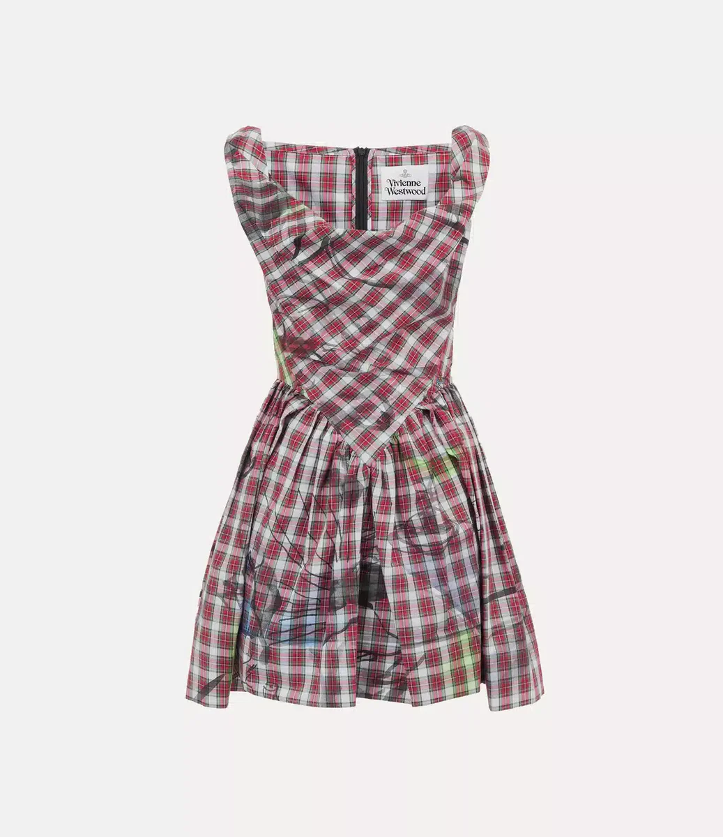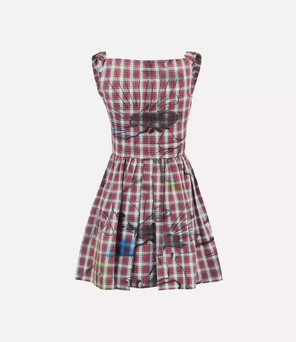 Esta temporada, nuestro vestido Mini Sunday está confeccionado con un estampado de cuadros escoceses rojos, que evoca una estética clásica y casera. Superpuesto con ilustraciones impresas dibujadas a mano por Dominic Myatt y acentuado con vibrantes grafitis, el diseño rinde homenaje al irreverente espíritu punk «DIY» de la casa.