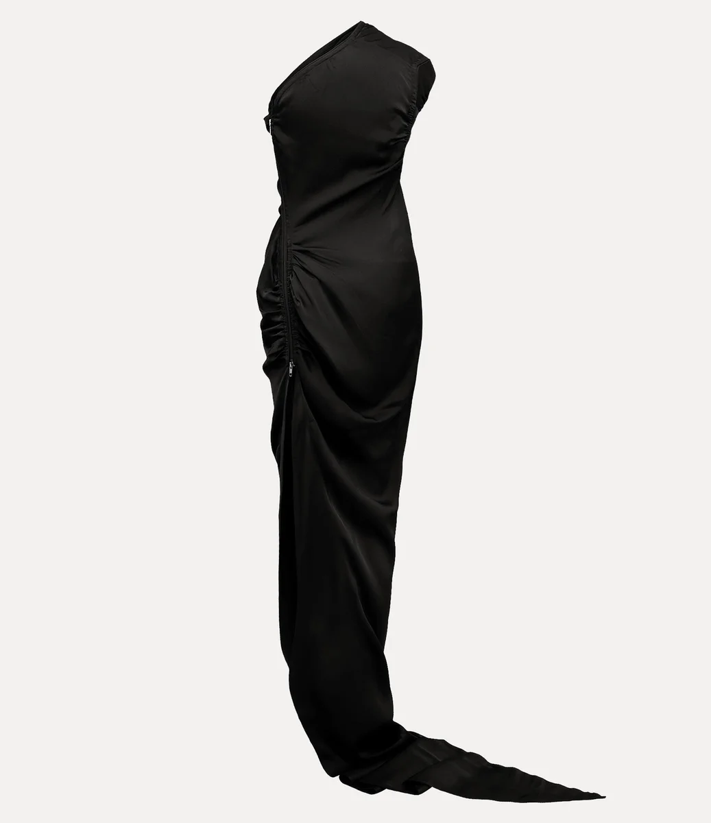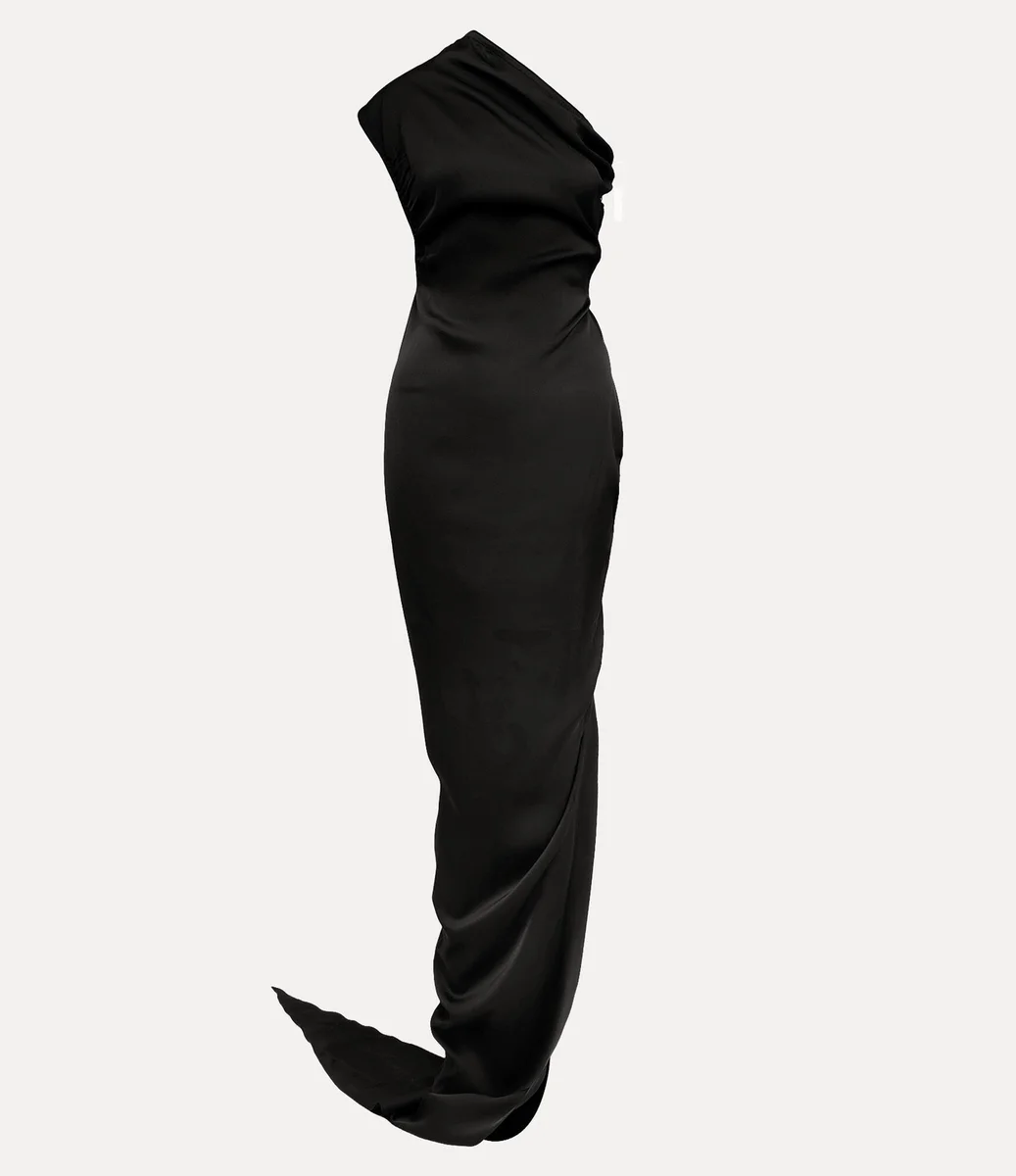 Nuestro vestido Andreas se caracteriza por su amplio escote de un solo hombro, que esculpe la forma con un corpiño ajustado y delicadas pinzas que trazan la silueta. A lo largo del lateral, unos suaves fruncidos recogen la tela en una suave caída, que se convierte en una elegante cola.