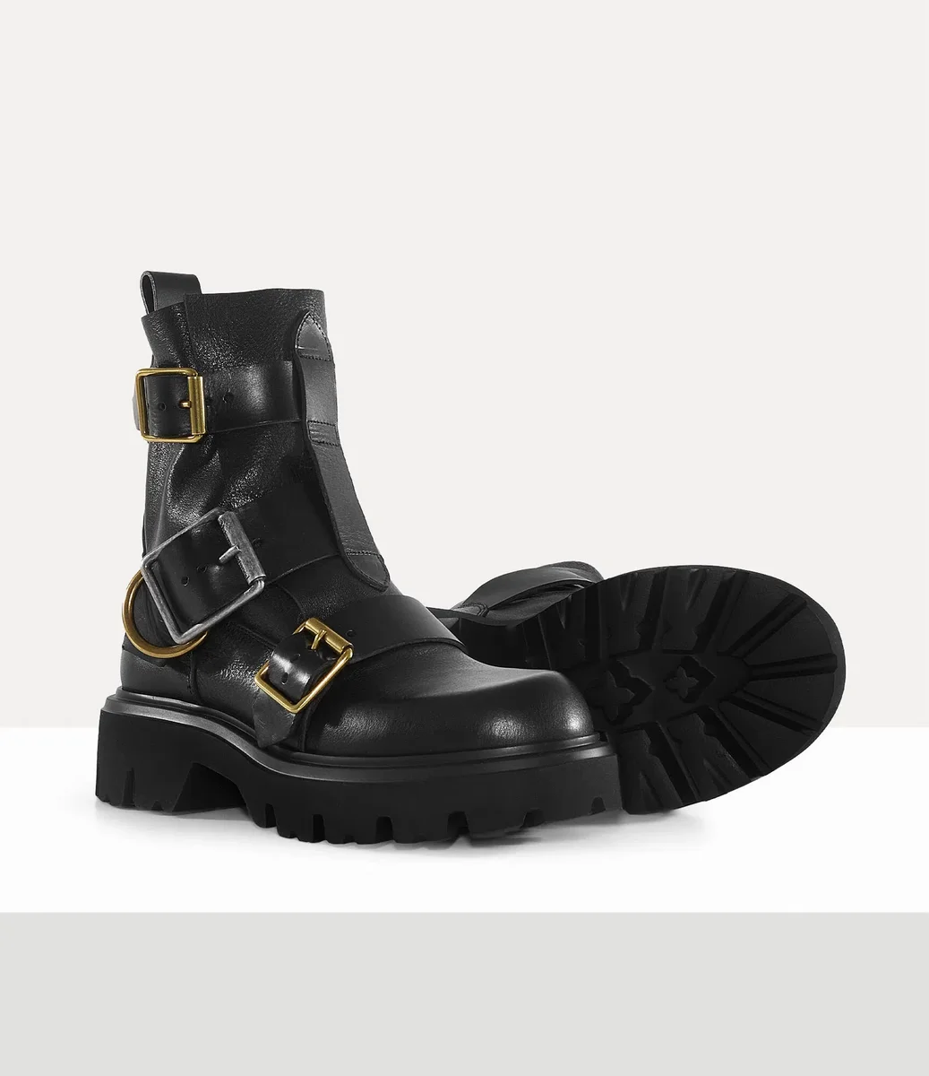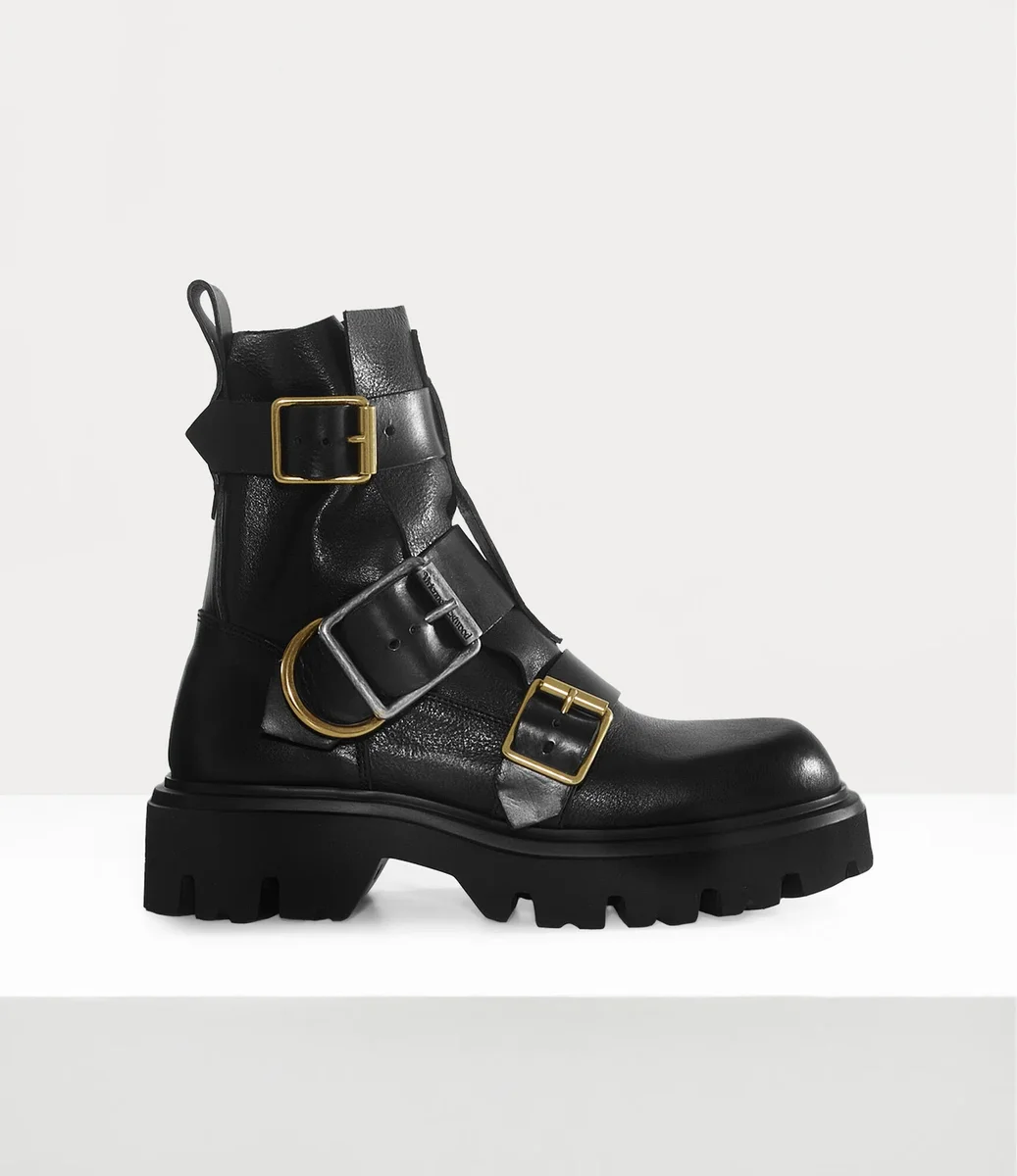 Las botas Empire se inspiran en las botas Rome de archivo, presentadas por primera vez en la colección Otoño-Invierno 1983 de la casa. El diseño presenta un acabado de cuero engrasado, adornado con correas de cuero con cinturón y detalles de hebillas de rodillo, que evocan temas de restricción y control inspirados en la ropa bondage y fetichista.