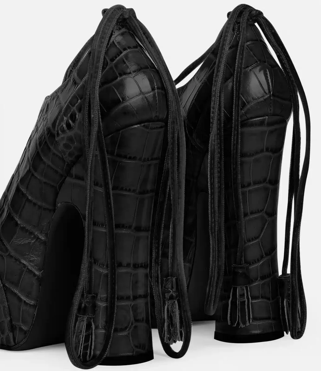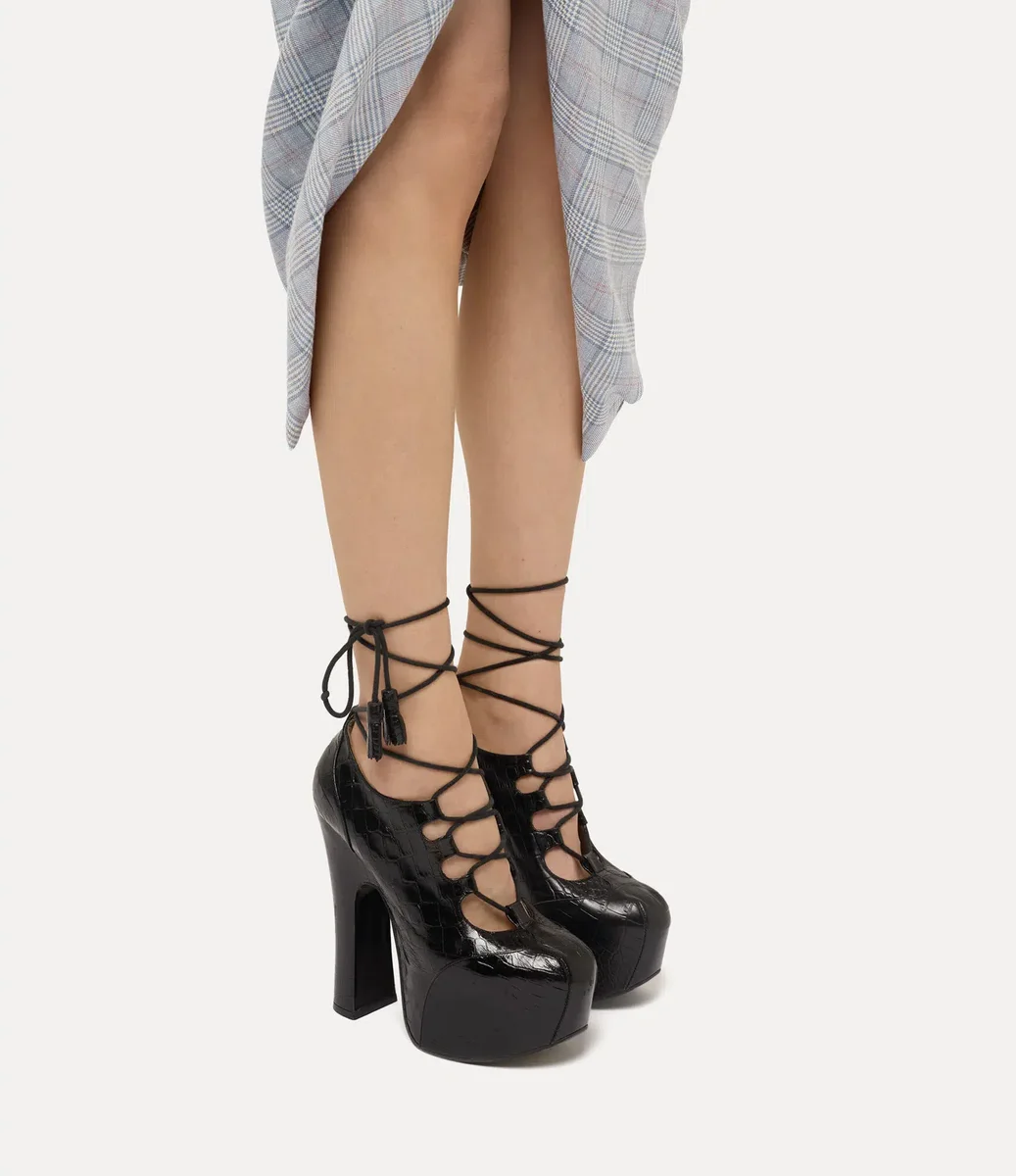 Inspiradas en la indumentaria tradicional de las Highlands escocesas, nuestras plataformas Elevated Ghille reinterpretan los clásicos zapatos brogue ghillie, con un motivo en relieve con efecto cocodrilo en todo el diseño. La pieza presenta una puntera corta y redondeada con los característicos detalles recortados, y se completa con largos cordones con borlas que envuelven el tobillo.