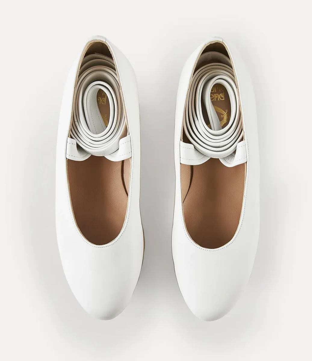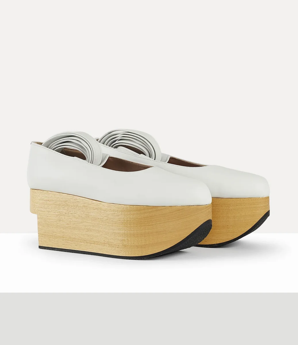 Nuestras bailarinas Rocking Horse se presentaron por primera vez en la colección «Harris Tweed» de otoño-invierno 87/88 de Vivienne Westwood, diseñadas para lograr equilibrio y movimiento. La puntera curvada y los detalles recortados en la plataforma alta de madera permiten a quien las lleva balancearse hacia delante al caminar, mientras que los delicados lazos de cuero se inspiran en las zapatillas de ballet.